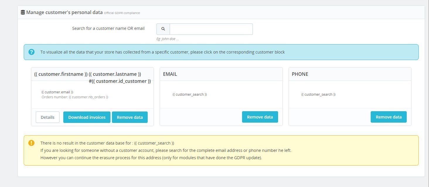 Dan.Jan Posted July 7, 2023 Share Posted July 7, 2023 (edited) Hello, I have problem with Official GDPR compliance (ver. 1.4.3) module in Prestashop 8 on localhost. User search doesn't work and the display in the "Manage customer personal data" block is some strange - see attachment. It works normally on my real hosting. Does anyone have a similar experience? Thank you. Edited July 7, 2023 by Dan.Jan (see edit history) Link to comment Share on other sites More sharing options...