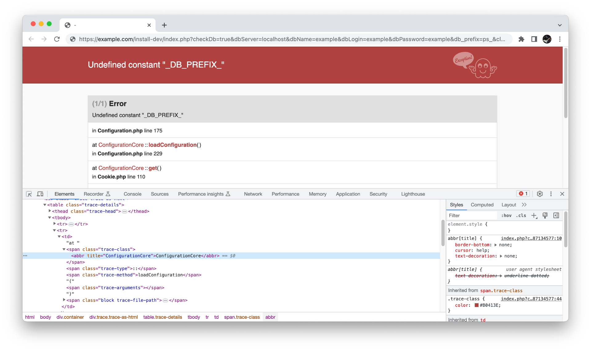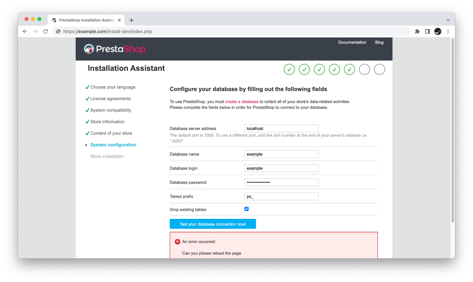 dbdropper Posted July 19, 2023 Share Posted July 19, 2023 (edited) Installing a Github copy of Prestahop, visiting the `localhost/install-dev` folder. I fill in my working (tested) database credentials on the *System configuration* step. I get the following error when I click Next. I can also see the same error when I inspect the AJAX request for the *Test your database connection now* button. I googled this error and nothing relevant comes up. Is this a known issue? How do I debug? Edited July 19, 2023 by dbdropper (see edit history) Link to comment Share on other sites More sharing options...