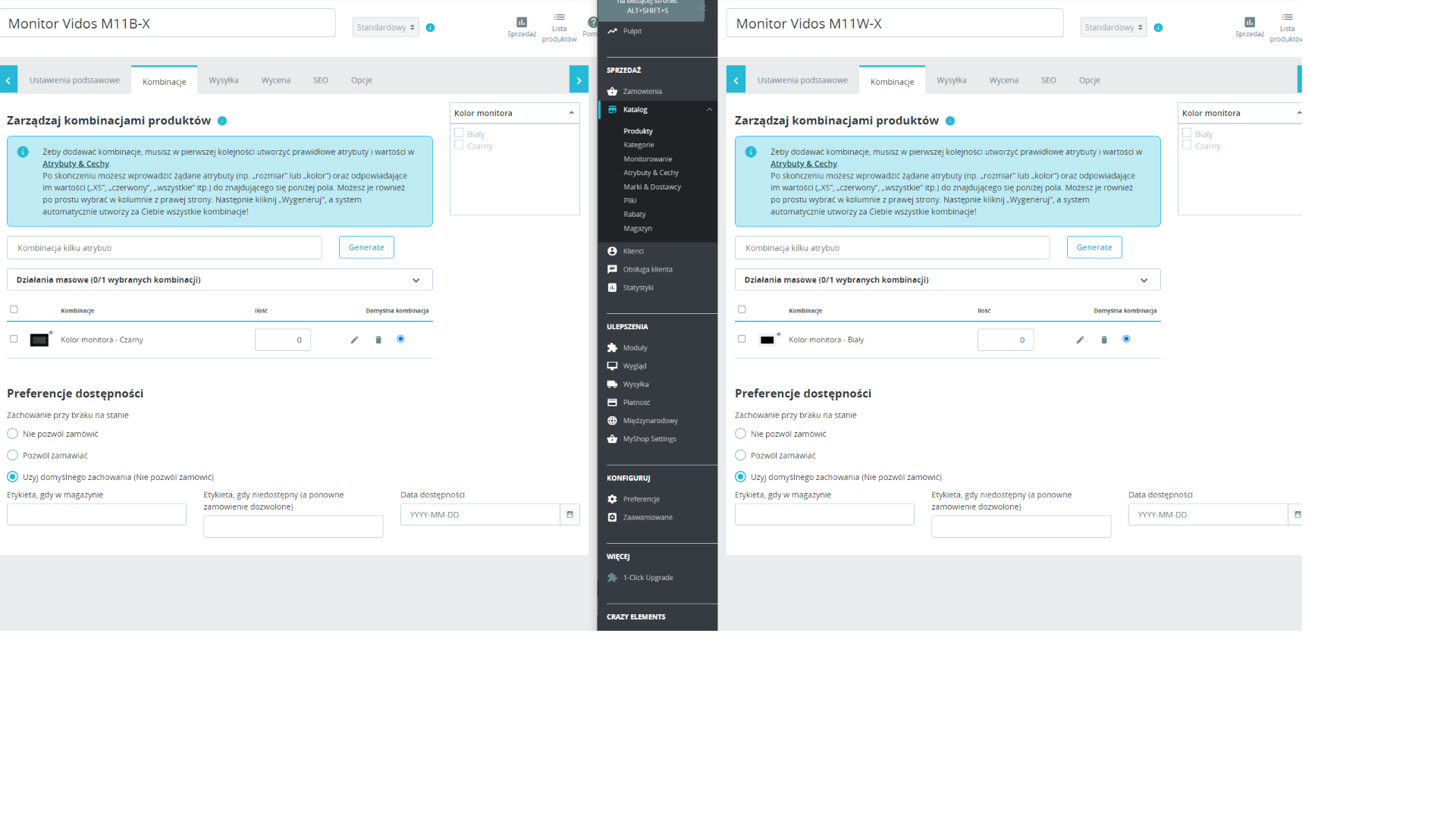 Tomi14 Posted July 23, 2023 Author Share Posted July 23, 2023 @krzysiek_webChyba nie umiem tego zrobić. Stworzyłem nowy produkt, nadałem nazwę, dodałem zdjęcie, napisałem opis "biały", przeszedłem do kombinacji, wybrałem z przygotowanych atrybutów i cech "biały" i "czarny"... I nie mam pojęcia gdzie teraz stworzyć produkt czarny. Nie ma drugiego pola do wpisania nazwy, indexu, opisu @endriu107 A czym to się różni od "kombinacji"? Bo wygląda dokładnie jak to czego szukam Czemu dużo klikania? Po prostu będę tworzył teraz nową linię produktów i chciałbym to stworzyć od zera. Czemu miało by wtedy to zająć dużo czasu? Link to comment Share on other sites More sharing options...
