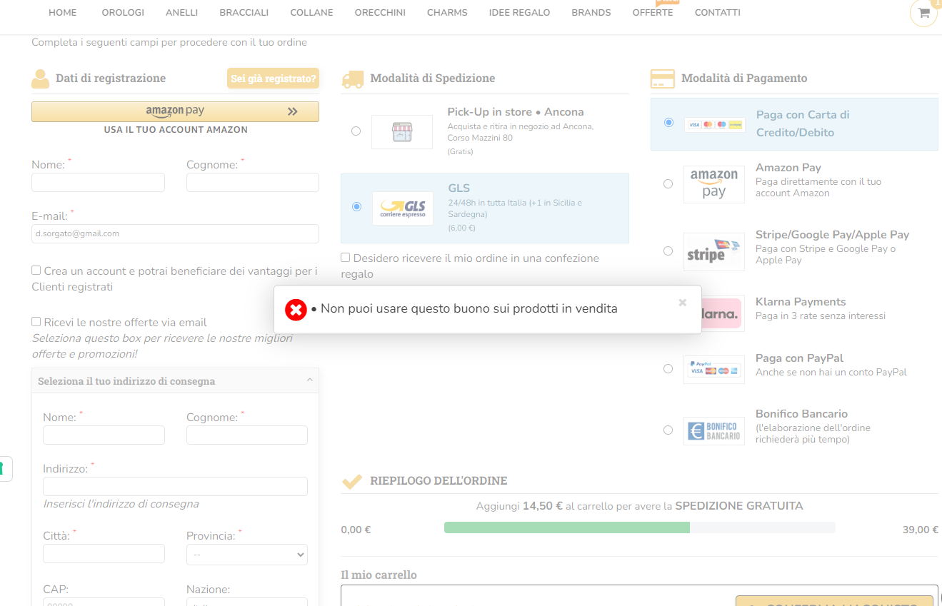 Diego-S Posted July 24, 2023 Share Posted July 24, 2023 Ciao e grazie in anticipo per l'aiuto fornito. Vi segnalo questo quesito che non sono riuscito a risolvere (loscrignoancona.it). Non riesco in nessun modo a cambiare il testo del popup modal realtivo al coupon-code. Vorrei aggiungere informazioni ma non ho trovato nulla ne nella traduzione del template (non quello di default) ne nella traduzione del modulo del carrello (OnePageCheckout PS). Ho provato ad implementare del CSS e del javascript ma nemmeno cosi sono riuscito. Cerco qualche idea per risolvere. Grazie! Link to comment Share on other sites More sharing options...