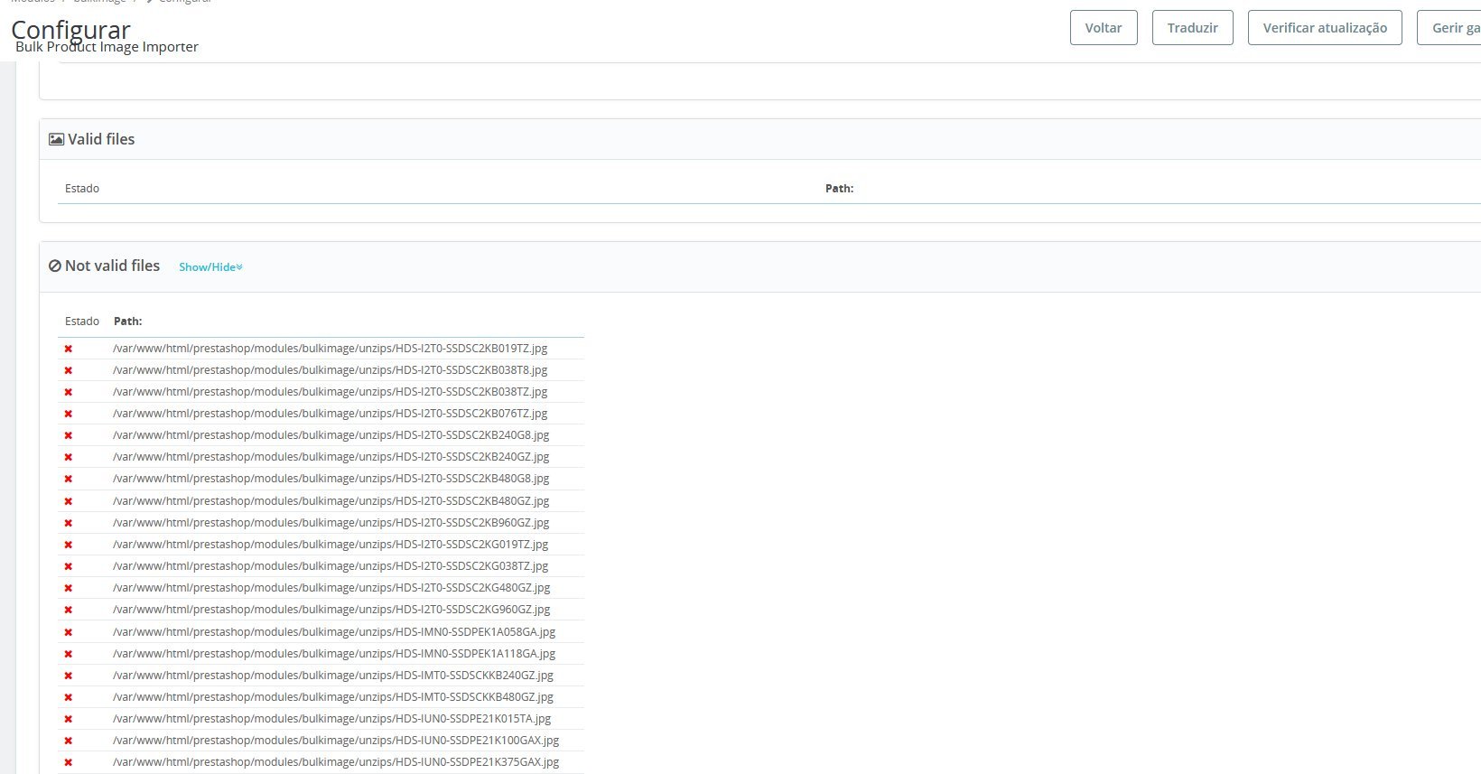musicmaster Posted August 10, 2023 Share Posted August 10, 2023 In addition to what Addweb said: - check one of those files (like /var/www/html/prestashop/modules/bulkimage/unzips/HDS-SSDSC2X8019TZ.jpg) that it is really present. Pay attention that it has exactly the name(incl higher and lowercase). And that it is a valid image that can be displayed. Link to comment Share on other sites More sharing options...