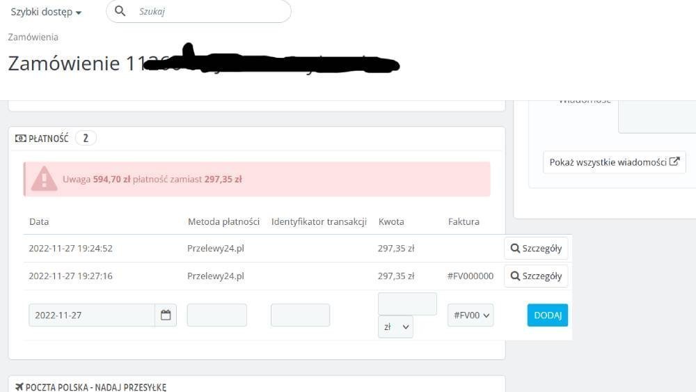 Zainstalowałam najnowszą wtyczkę Przelewy24 (ze strony Przelewów24), oczywiście tą poprzednią wersję odinstalowałam. W chwili obecnej po złożeniu zamówienia i wybraniu metody płatności Przelewy24, w administracji tworzy się zamówienie i status "płatność przelewy24 przyjęta" jednak po 1 lub 2 minutach jest jakby tworzona druga płatność przez Przelewy24 i wysyła maila do klienta o błędzie w płatności (na szczęście nie pobiera drugiej płatności). Zgłosiłam tą sytuację do pomocy w Przelewach24 i kazali mi wykonać takie czynności:
