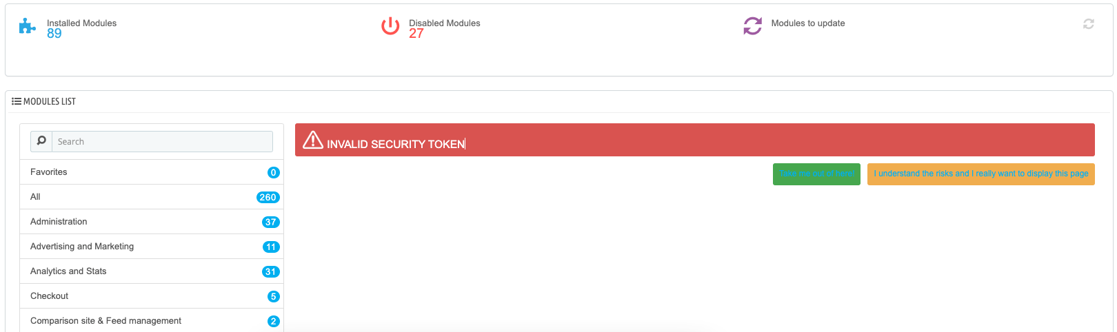 Aquavilla Posted September 7, 2023 Share Posted September 7, 2023 We just purchased a new addon module. I uploaded the zipped module on the modules page. After that, the whole system started giving me errors. All I keep getting is the invalid security token when I try to change the tabs on the side. Like so : Also, when I try to change the filter at the top to the non-installed modules, the ajax-tab.php?controller=AdminModules result gives me the same thing: Finally, I'm also getting errors when trying to add products. Here is the error: Link to comment Share on other sites More sharing options...
