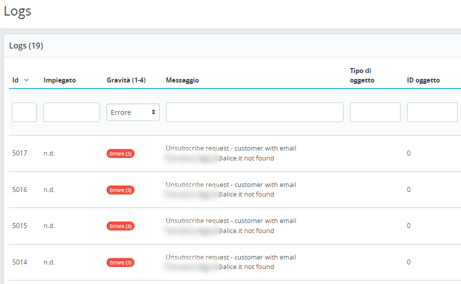 DARKF3D3 Posted September 18, 2023 Share Posted September 18, 2023 I have been using PS8.1 for a few weeks now and in the last few days I get errors like the following in the prestashop log: Unsubscribe request - customer with email [email protected] not found The email addresses are not of registered customers, only newsletter subscribers. It is not clear to me where these unsubscribe requests come from and how in particular they return an error. Link to comment Share on other sites More sharing options...