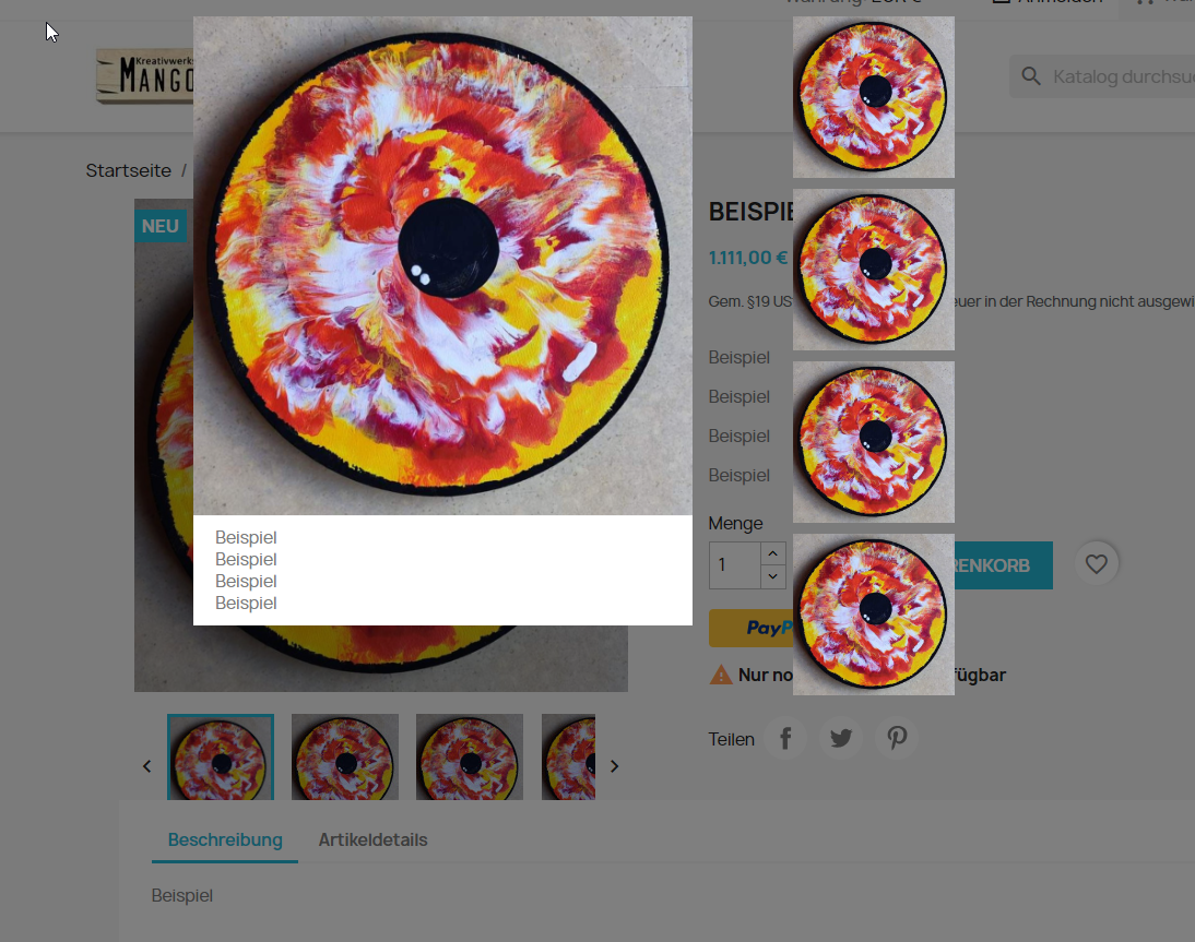 cyberspaceschwabe Posted September 22, 2023 Share Posted September 22, 2023 Hallo Benutze Prestashop 1.7.8.9 soweit auch ganz gut bin am einrichten. Was mich etwas stört ist wenn ich bei einem Artikel auf die Lupe klicke werden diese kleiner dargestellt als ohne Lupe Dieses Problem hatte ich auch schon bei 1.7.6 benutze das Classic Theme www.Kreativwerkstatt-mangold.de/store gruss Stefan Link to comment Share on other sites More sharing options...
