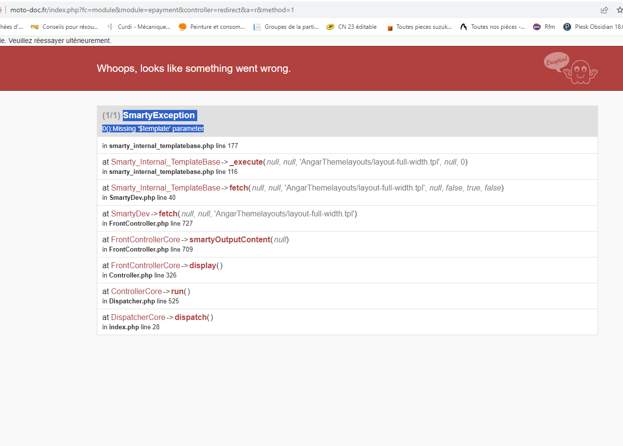 Moto-Doc Posted October 5, 2023 Share Posted October 5, 2023 Bonjour à toutes et tous, Plus rien ne fonctionne lorsqu'il s'agit de passer un paiement, j'obtiens une erreur SmartyException 0():Missing '$template' parameter... Profitant d'une migration, j'ai fait un upgrade de version (1.7.6 > 1.7.8), donc un truc fou non plus, rebalancé les tables de ma base (clients, factures, adresses, produits, etc...), et bien, c'est sacré bazar depuis. J'ai réussi à en éliminer pas mal, mais là, je suis planté. Merci de votre coup de main. Link to comment Share on other sites More sharing options...
