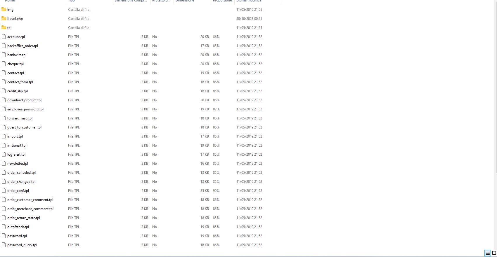 Fabry Posted October 31, 2023 Share Posted October 31, 2023 (edited) Ciao allora questi sono template per le mail e per usarli deve prima installare il modulo per gestire i template...ps_emailsmanager Quella "roba in php" la cancelli:-) Fatto questo poi in manuale con ftp o da cpanel/plesk carica la cartella scompattata del template ( Kovel che contiene a sua volta due cartelle img e tpl che ha acquistato all'interno di ps_emailsmanager/imports a posto:-) Poi dallo strsso modulo che gestisce le mail vedrá che comparira il nuovo template email e quindi lo seleziona ed a quel punto tutte le mail del sistema ( non quelle inviate peró all'admin dello shop ) avranno questo layout spero sia chiaro ciao Edited October 31, 2023 by Fabry precisazione (see edit history) Link to comment Share on other sites More sharing options...