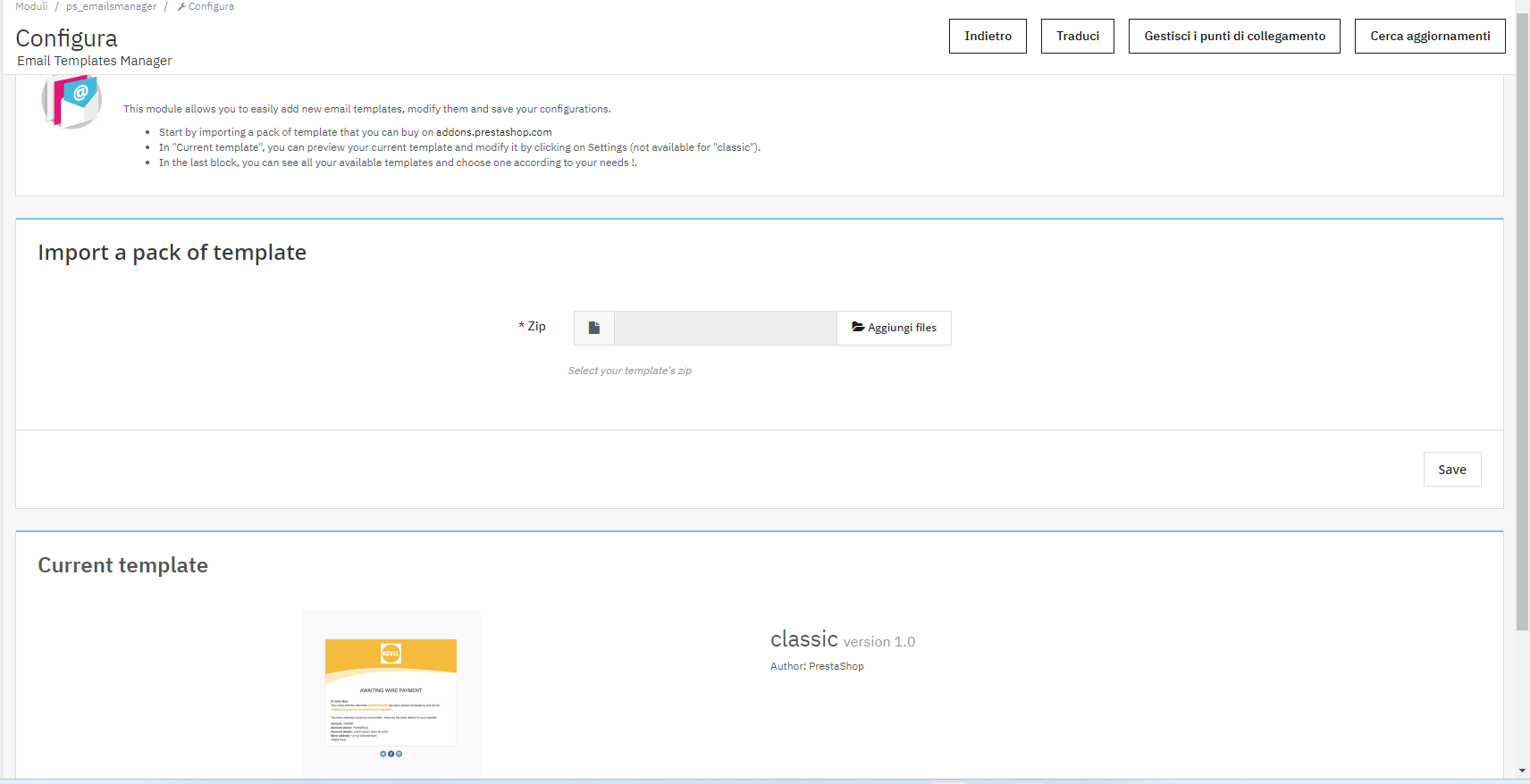 clagto Posted October 31, 2023 Author Share Posted October 31, 2023 mi spiego meglio cosa ho fatto per fare un test e vedere se era il modulo Email Templates Manager anon funzionare quando provavo ad istallarlo manualmente, inserendo la cartella in modulus del del mio ftp, ho eliminato ed ho caricato manulamete Email Templates Manager, ma anche con questo non appariva nel mio bo. allora da modulus ho eliminato la cartella ps_emailsmaneger.php e da allora quando vado ad istallarlo, lo istalla, mq quando cavdo a configurare il modulo mi da errore. Link to comment Share on other sites More sharing options...