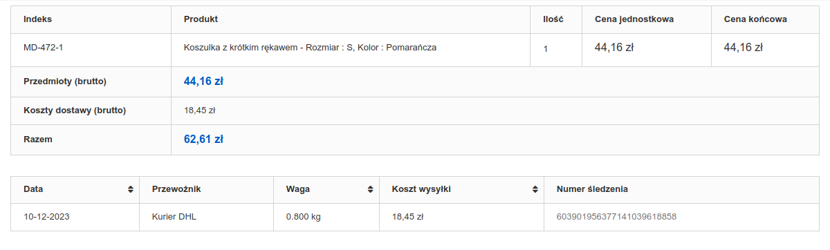 Mam problem z ceną netto wysyłki w Moje Zamówienia. W bloku, w którym jest podawany numer śledzenia wyświetla się cena netto przesyłki. Powyżej w podsumowaniu wszystko jest ok. Czy miał ktoś ten problem lub wie jak go rozwiązać/gdzie szukać?