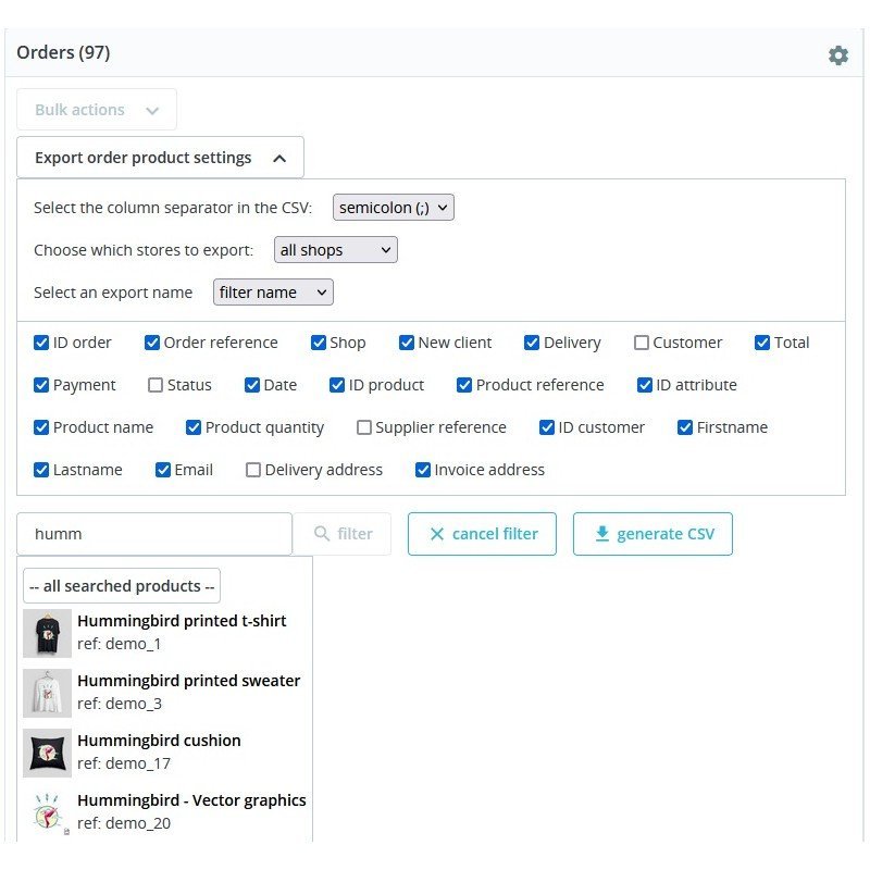 4presta Posted December 18, 2023 Share Posted December 18, 2023 Filter orders by product The module allows you to search for orders by product name, EAN code or reference in the list of orders. Allows quick export to a CSV file. The module also supports searching and filtering in the list of orders. Each employee can filter separately. PrestaShop: 1.7.0.0 - 8.1.3 Module version: 1.0.7 Translate: CS, DE, EN, ES, FR, IT, PL, SK BUY NOW HERE In the administration in the list of orders, you will see the "Filter tool" above the table. It has very simple controls. 1. Order export settings by product - in the drop-down list, you choose the column separator in the CSV file (comma, semicolon, pipe) - in the drop-down list, you choose from which store the orders should be exported (all stores, current store) - in the drop-down list you choose the name of the CSV file (current date, filter name) - in the drop-down list, you check which columns are to be exported to a CSV file - everything is saved in the background, no need to reload the page 2. Search box - enter part of the product name or part of the EAN code or part of the product code in the search field (minimum three characters) - if any products are found, the list will expand and here you can choose either "All found products" or choose only one product found 3. Filter button - if you have selected the found product or all products, the "filter" button is enabled and click this button to start filtering - if you come to the order list page and have a "filter" saved, the box will turn red to let you know about it 4. Button "cancel filter" - click this button to cancel filtering by product, but it will not affect the filtering in the table 5. Button "generate CSV" - generates a CSV file according to all filters and starts downloading the generated CSV The module was tested on Prestashop versions: - 1.7.0.0, 1.7.2.6, 1.7.4.0, 1.7.5.0, 1.7.6.4, 1.7.6.5, 1.7.7.0, 1.7.7.2, 1.7.8.10, 8.1.2 - the mentioned versions always have some changes in the list of orders and thus full compatibility and functionality are guaranteed Link to comment Share on other sites More sharing options...