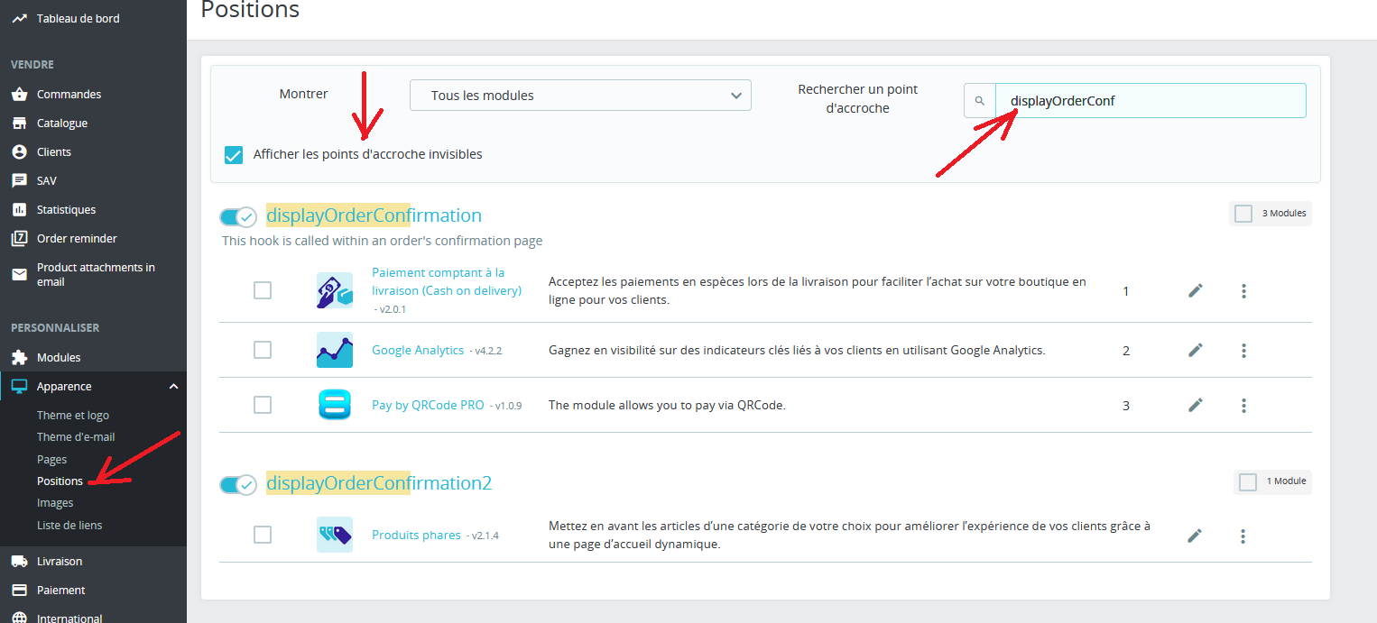 4presta Posted January 2, 2024 Share Posted January 2, 2024 (edited) Bonjour. Il y a deux hooks dans le modèle TPL. Il est nécessaire de savoir quel hook utilise quel module de paiement. Ce sont des hooks : displayOrderConfirmation et displayOrderConfirmation1 et displayOrderConfirmation2 dans Prestashop 8.1.x Vous pouvez trouver les crochets tout en bas de votre modèle ./themes/your_theme/templates/checkout/order-confirmation.tpl Vous pouvez retrouver la position des hooks dans l'administration dans le Menu de gauche dans la section design Edited January 2, 2024 by ps8moduly.cz (see edit history) Link to comment Share on other sites More sharing options...