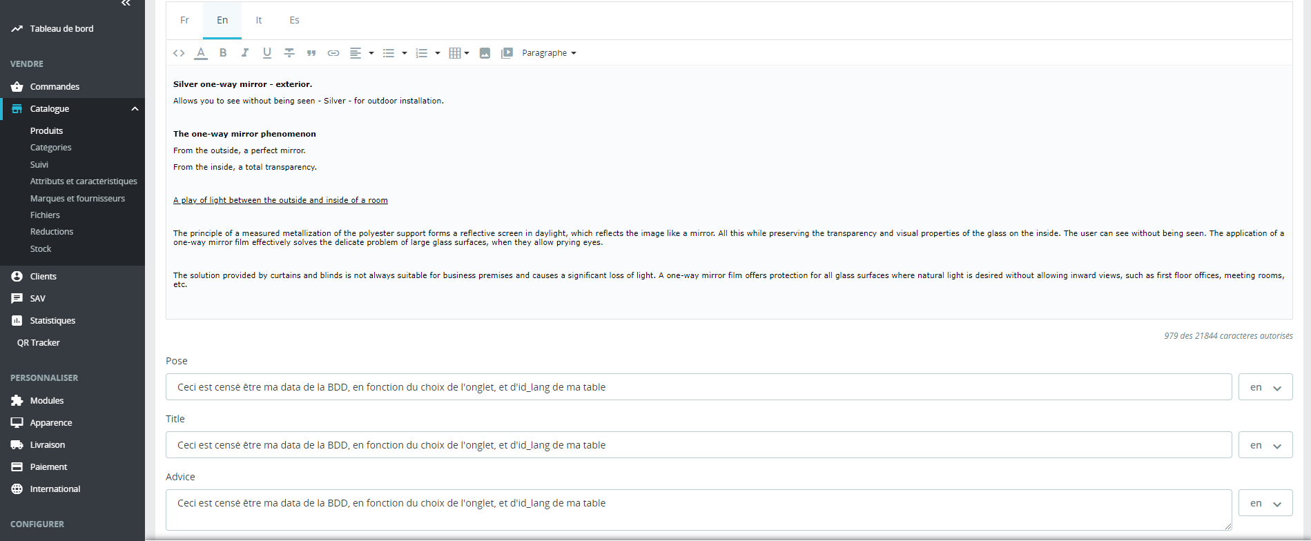 Mon soucis, c'est au niveau des langues. J'ai, pour chacun de ces champs custom, un onglet Langue, qui regroupe les langues actives du Prestashop, ici en sélectionnant "FR"