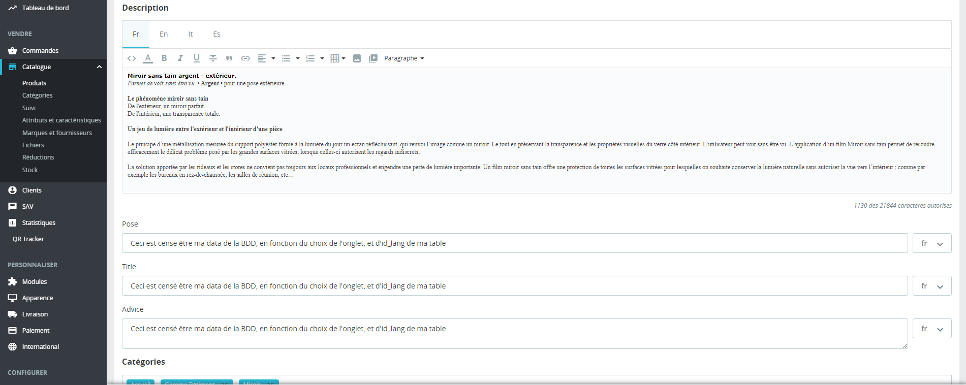 J'ai bien les nouveaux champs qui s'affichent où je veux sur la fiche produit, tout va bien au niveau de l'enregistrement des données dans mes tables custom en BDD.