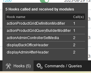 Geronimo2012 Posted January 22, 2024 Author Share Posted January 22, 2024 2 hours ago, Daresh said: In 8.1.2 your code should work, I just tested it out by extending my Gridder module with date_add and date_upd columns, your code looks quite good. Are you sure the hooks got attached? The Symfony debugger may be helpful here. When I open Product page in bottom I notice: Should I expect hooks hookActionProductGridDefinitionModifier and hookActionProductGridQueryBuilderModifier here? Link to comment Share on other sites More sharing options...