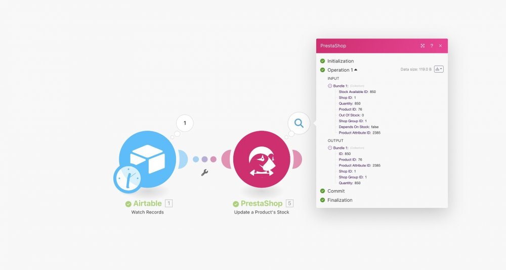 studio109 Posted January 29, 2024 Share Posted January 29, 2024 (edited) Salut Je souhaite uniquement mettre à jour les stocks de mes produits à partir d'une tâche automatisé avec Make, airtable et prestashop. Comme vous pouvez le voir sur les captures d'écran, le scénario fonctionne et prend la nouvelle valeur du stock sur airtable puis la sortie prestashop indique également la quantité à 850. Lorsque je vais sur le backoffice de mon prestashop, la valeur n'a pas été modifiée à 850 et reste à 871. Make pense que cela vient d'un bug de l'api de prestashop webservices 8.1.3. Est-ce que quelqu'un a connu ce problème Merci pour votre aide Edited January 29, 2024 by studio109 (see edit history) Link to comment Share on other sites More sharing options...