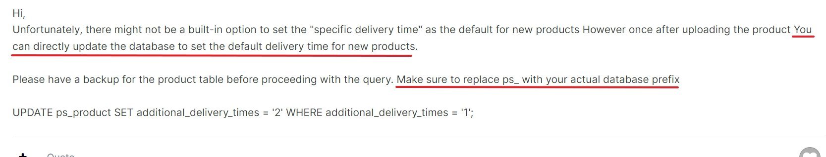 Knowband Plugins Posted February 7, 2024 Share Posted February 7, 2024 Hi, Unfortunately, there might not be a built-in option to set the "specific delivery time" as the default for new products However once after uploading the product You can directly update the database to set the default delivery time for new products. Please have a backup for the product table before proceeding with the query. Make sure to replace ps_ with your actual database prefix UPDATE ps_product SET additional_delivery_times = '2' WHERE additional_delivery_times = '1'; Link to comment Share on other sites More sharing options...