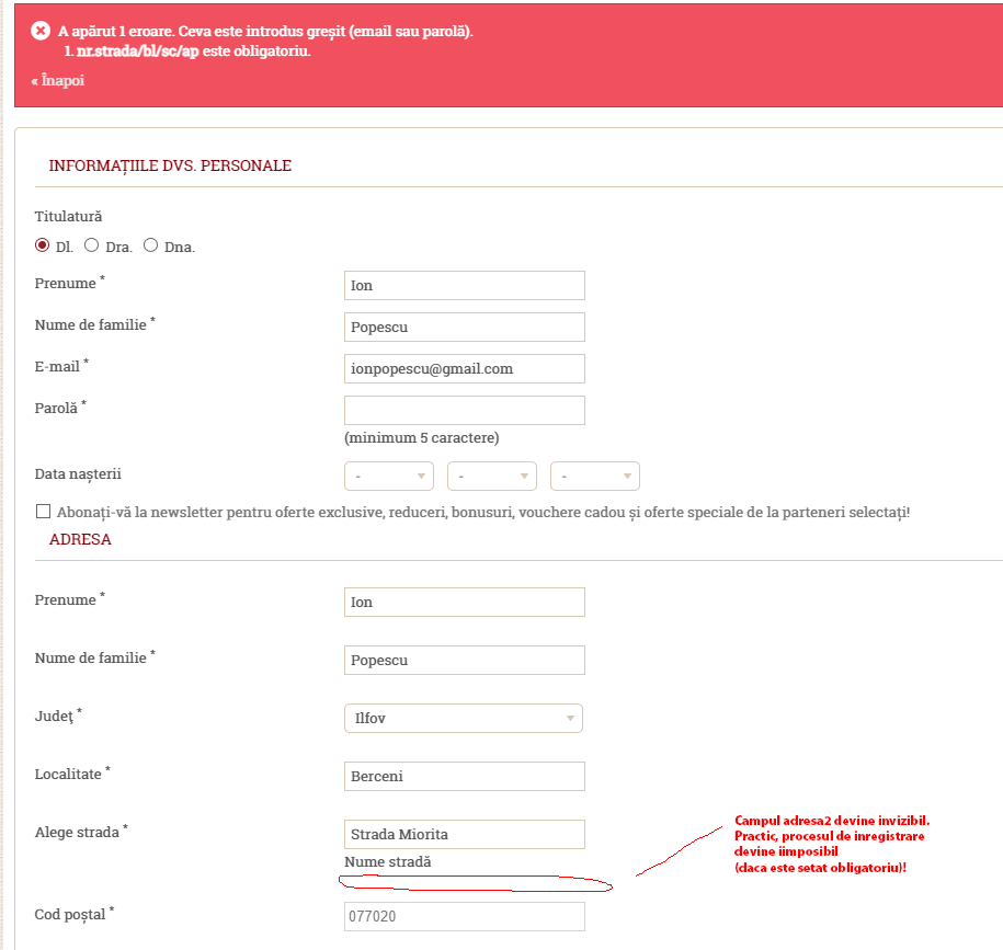 Razvan Socolov Posted February 7, 2024 Share Posted February 7, 2024 (edited) Salutare! Am o alta problema la formularul de inregistrare pentru client nou: daca setez al doilea camp de adresa (address2) ca fiind obligatoriu, daca este sarit si nu este completat nimic in el, dupa eroarea de finalizare proces de inregistrare nu se mai poate reveni la camp, devine invizibil. Daca este lasat optional, a devenit obicei pentru clienti sa-mi completeze doar strada (este tip dropdown) si omit sa-mi puna numarul strazii si restul de informatii. Aveti idee unde ar trebui sa ma uit? As dori tare mult sa pun si campul secundar de adresa obligatoriu. Le-am pus toate datele, dublat... tot sar peste ele... Edited February 7, 2024 by Razvan Socolov (see edit history) Link to comment Share on other sites More sharing options...