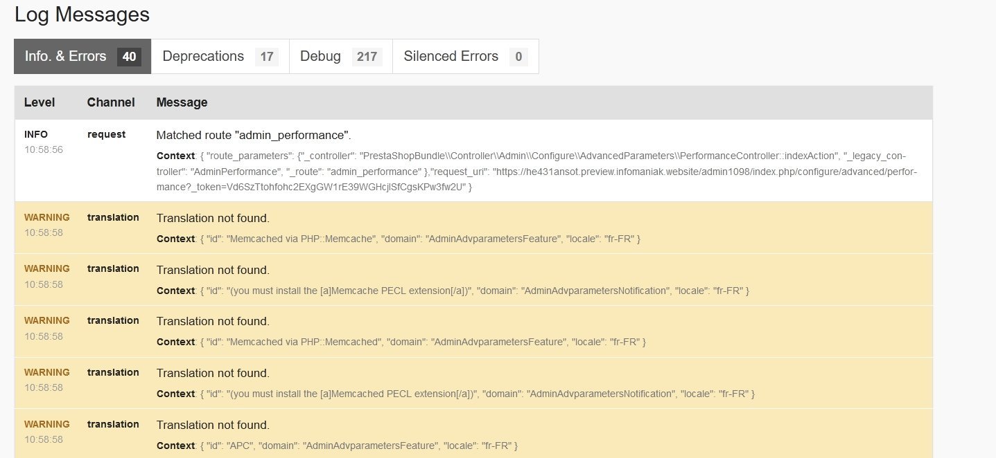 Youssef44 Posted February 10, 2024 Author Share Posted February 10, 2024 22 hours ago, Prestashop Addict said: Do you have error or warning when you disable cache? (activate debug to see all) Thank you "Prestashop Addict", here is some screenshots after activating debug, I don't see anything special... Link to comment Share on other sites More sharing options...