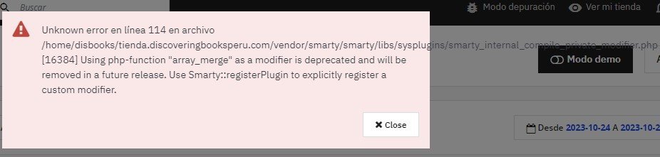 Lijaser Posted February 17, 2024 Share Posted February 17, 2024 Como les va estimados. Les pido su apoyo. Ya hace unas semanas que puse online mi tienda, pero hace unos días me apareció un problema. Tengo la version 8.10 Es que al querer entrar a la trastienda.. la página tarda en cargar y aparece el error: "500 Internal Server Error". La única manera de entrar es activar el modo debug. Y cada vez que entro de ese modo me aparece el siguiente error: Unknown error en línea 114 en archivo /home/disbooks/tienda.discoveringbooksperu.com/vendor/smarty/smarty/libs/sysplugins/smarty_internal_compile_private_modifier.php [16384] Using php-function "array_merge" as a modifier is deprecated and will be removed in a future release. Use Smarty::registerPlugin to explicitly register a custom modifier. Pero no se que hacer ahi... si alguién me puede guiar y volverlo a la normalidad. Todo esto empezo al actualizar el modulo del Marketplace de prestashop, resulta que apareció un baner que decia que actualice el modulo para obtener nuevas caracteristicas.. Gracias 1 Link to comment Share on other sites More sharing options...
