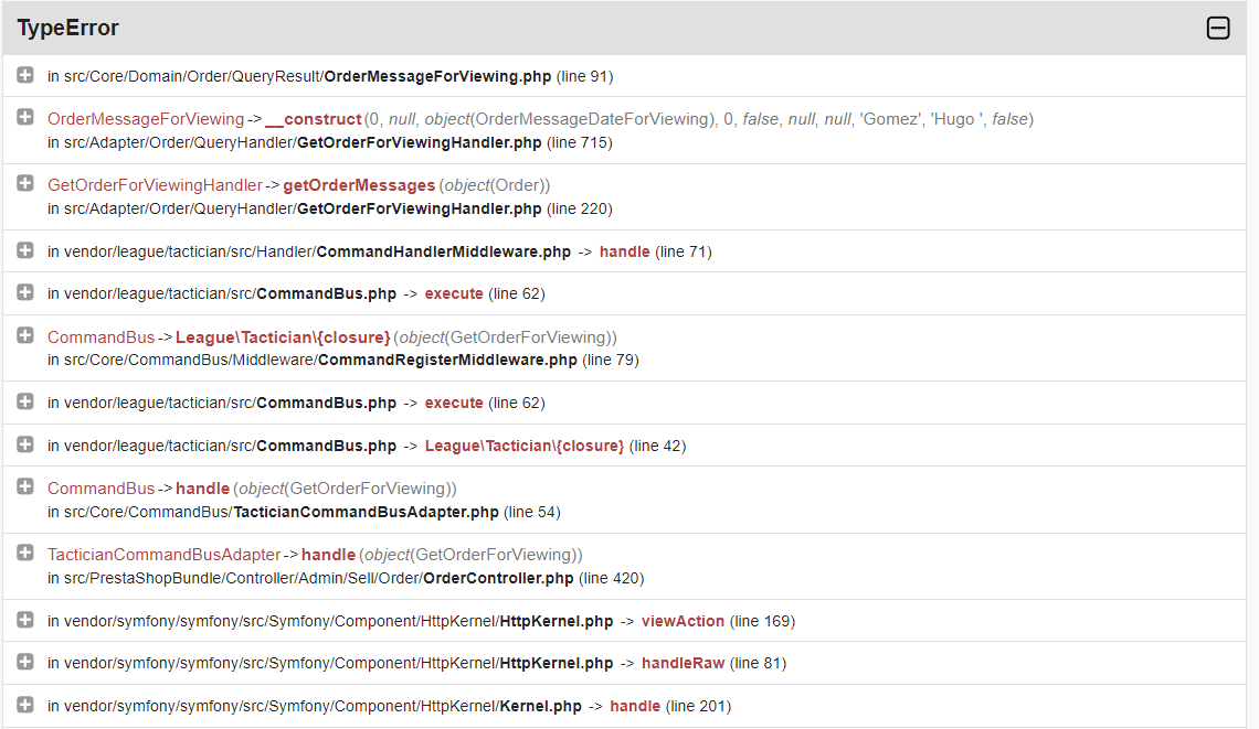 Deewey Posted February 20, 2024 Share Posted February 20, 2024 (edited) Bonjour à tous, Depuis la mise à jour vers PrestaShop 8.1.3 (version GitHub), je n'ai plus accès aux détails de mes anciennes commandes. Dès que je clique sur "Détail", une erreur s'affiche : Quote "Argument 2 passed to PrestaShop\PrestaShop\Core\Domain\Order\QueryResult\OrderMessageForViewing::__construct() must be of the type string, null given, called in ****/src/Adapter/Order/QueryHandler/GetOrderForViewingHandler.php on line 715." J'ai parcouru les forums et certains évoquent des caractères "null" dans certaines tables. J'ai donc contrôlé toutes ces tables et vérifié avec des requêtes pour modifier le "null" en " ", mais sans succès. Mise à part cette piste, je ne trouve rien d'autre. Quelqu'un aurait-il une idée ou aurait-il déjà rencontré ce problème ? Je joins une capture d'écran des différentes erreurs, au cas où cela pourrait aider. merci d'avance, Edited February 20, 2024 by Deewey (see edit history) Link to comment Share on other sites More sharing options...