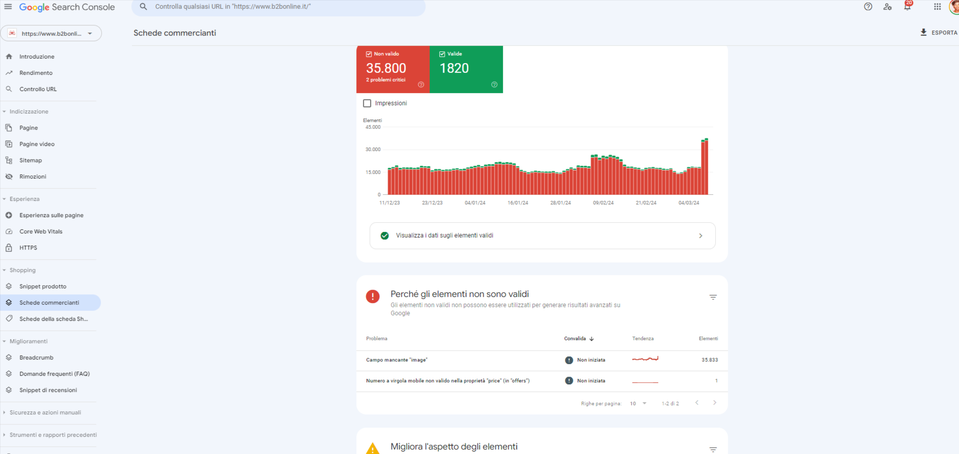 Tony M. Posted March 10, 2024 Share Posted March 10, 2024 Ciao a tutti, in questi mesi sto provando ad applicare alcune migliorie del mio E-Shop P.S. 1.7.6.2. Ultimamente, sto cercando di renderlo più simpatico a Google quindi volevo sistemare alcuni problemi che Google sta rilevando. Si tratta del campo "image" (ma ci sono anche altri) sul quale Mr. G mi sta rilevando circa 36000 elementi non validi nella scheda commercianti, e che credo sia importante per una migliore visibilità sotto gli occhi di G. Allego foto per rendere meglio l'idea. Grazie in aticicipo a chi mi potrà offrire una soluzione. Ciao. Tony. Link to comment Share on other sites More sharing options...