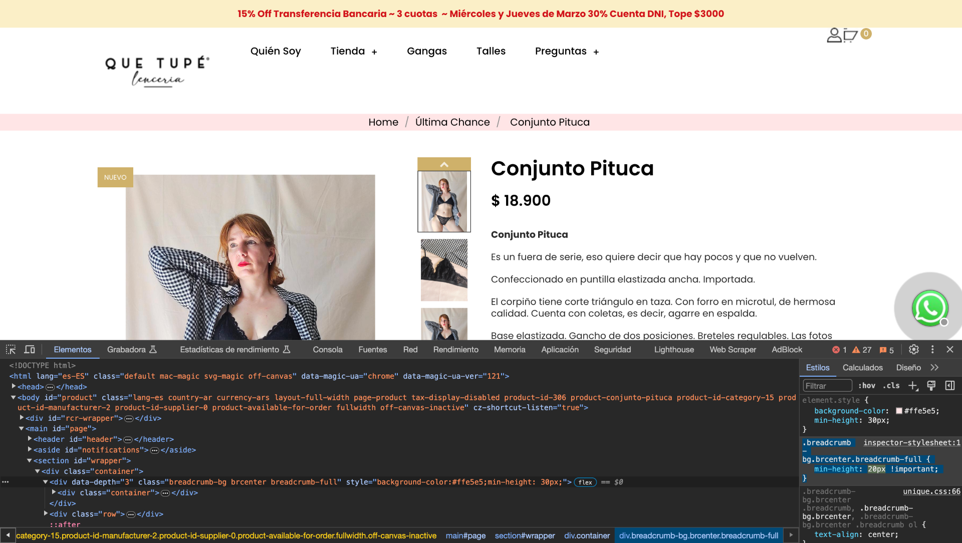 JuanjoG Posted March 21, 2024 Share Posted March 21, 2024 Te pongo las respuesta a lo que buscas: 1- La parte que pone todas las categorías del producto. O al menos reducir su tamaño. .breadcrumb-bg.brcenter.breadcrumb-full { min-height: 20px !important; } 2- La parte de filtrar porque no me es de utilidad. .row.sort-by-row { display: none; } Link to comment Share on other sites More sharing options...