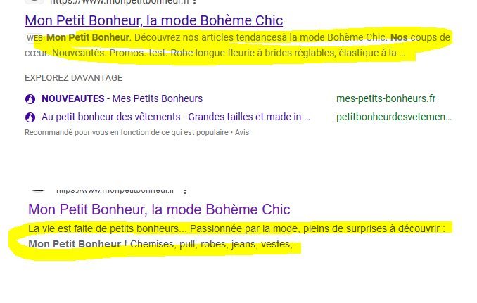 Gavimse Posted September 10, 2024 Author Share Posted September 10, 2024 Visiblement on n'a pas la main là-dessus. Il faut saisir sa meta description et espérer. Personnellement en mars au moment de la création de ce topic ce n'était pas bon, aujourd'hui c'est ok. Link to comment Share on other sites More sharing options...