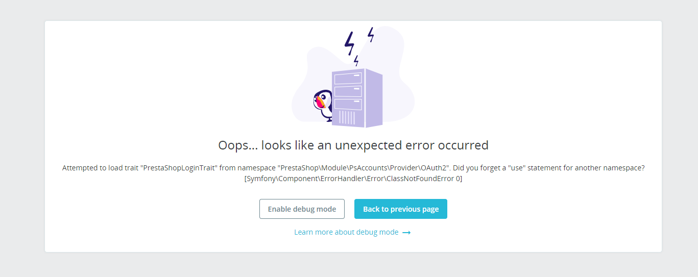 mrctm Posted March 14, 2024 Share Posted March 14, 2024 Buona sera, non riesco più accedere al Back Office del sito dopo l'aggiornamento di oggi a 8.1.4, prima avevo la versione 8.1.3. In log error ho questo: [14-Mar-2024 19:21:02 Europe/Rome] PHP Fatal error: Trait "PrestaShop\Module\PsAccounts\Provider\OAuth2\PrestaShopLoginTrait" not found in /home/lamelagr/public_html/modules/ps_accounts/controllers/admin/AdminOAuth2PsAccountsController.php on line 43 E la pagina si presenta cosi. Grazie in anticipo a chi mi risponderà. Conto su di voi, che l'assistenza lasciamo perdere. Link to comment Share on other sites More sharing options...