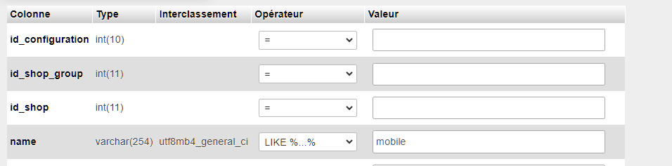 kerlin Posted March 17, 2024 Share Posted March 17, 2024 vous êtes passé d'une page à l'autre ? Cliquez sur le bouton Rechercher en haut. A la ligne name, choisissez l'opérateur LIKE % % et dans Valeur tapez mobile, cela devrait afficher la ligne Pour mettre à jour, en installant un autre Prestashop avec un sous domaine, dans un autre dossier, avec une autre base de données si c'est possible sinon en paramétrant un autre préfixe pour les tables au moment de l'installation, vous aurez tout le loisir de travailler dessus sans que cela ne perturbe le site actuel Link to comment Share on other sites More sharing options...