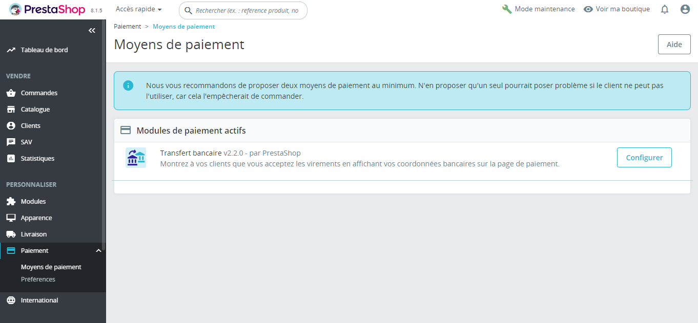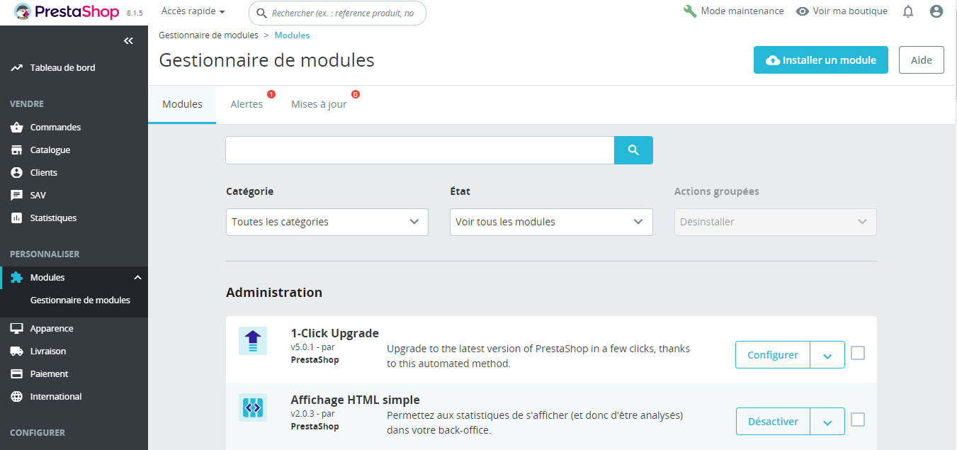 Mediacom87 Posted March 22, 2024 Share Posted March 22, 2024 Bonjour, Merci de ne créer qu'une seule fois vos topic et vérifiant que vous êtes dans la bonne section, là vos deux topic sont tous les deux dans une mauvaise section du forum et donc auront moins de chance de trouver une réponse. En réfléchissant, vous semblez vouloir savoir pourquoi vous ne pouvez pas installer les modules disponibles sur Addons directement à partir de votre espace de gestion de modules sur votre boutique. Simplement par ce que vous avez pris la décision d'installer, et à raison, la version open source de PrestaShop 8 qui est une version justement sans les liens vers toute la publicité imposée par PrestaShop SA. Vous pouvez réinstaller les modules qui font le lien vers Addons, bon, je ne vous le conseille pas, mais vous faites comme vous voulez. Link to comment Share on other sites More sharing options...