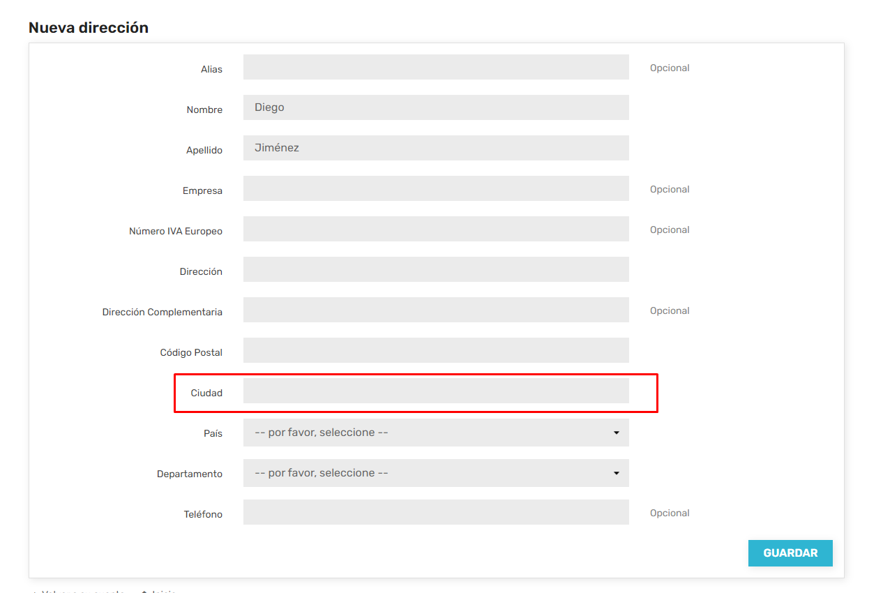diego.jimenez Posted April 19, 2024 Share Posted April 19, 2024 Buen día, Necesito de su ayuda para eliminar el campo de ciudad dentro del formulario de direcciones. Si lo elimino desde el back (en la modificación del país) solo va a desaparecer cuando en el front el usuario seleccione ese país al que previamente se le quitó el campo de ciudad. Es decir, necesito que desde un inicio (sin que se haya seleccionado el país) no se muestre el campo de ciudad así como aparece en la imagen. Tal vez se deba modificar algún archivo .tpl o .php, pero desconozco tanto la ruta como el archivo en sí. De antemano muchas gracias a quien me pueda ayudar. Saludos. Link to comment Share on other sites More sharing options...