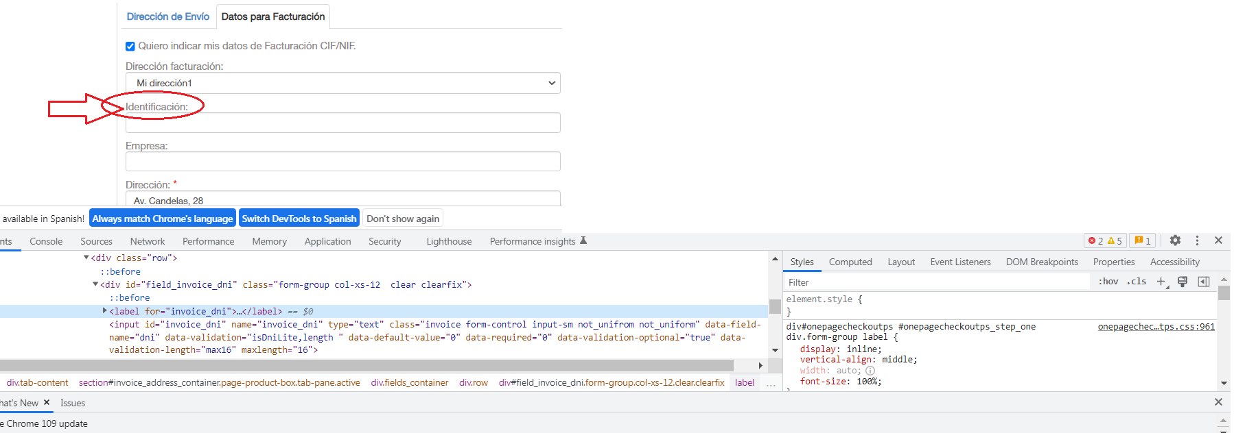 marvarez Posted April 22, 2024 Share Posted April 22, 2024 Hola compañeros, después de estar horas buscando cómo cambiar el nombre del campo "identificación" de nuestra tienda online, accedo a preguntaros por si alguien nos pudiera echar una mano, pues hemos buscado por las plantillas, traducciones de módulos... TODO y no hemos sido capaces de encontrar cómo cambiar éste campo por CIF/NIF (por ejemplo), ya que a algunos clientes les causa duda que ponga "Identificación" en lugar del CIF/NIF. Adjunto captura de pantalla por si os pudiera servir a qué me refiero. Muchísimas gracias por vuestro tiempo y sean bien merecidas sus ayudas. Un saludo (Tenemos Prestashop 1.6) Link to comment Share on other sites More sharing options...