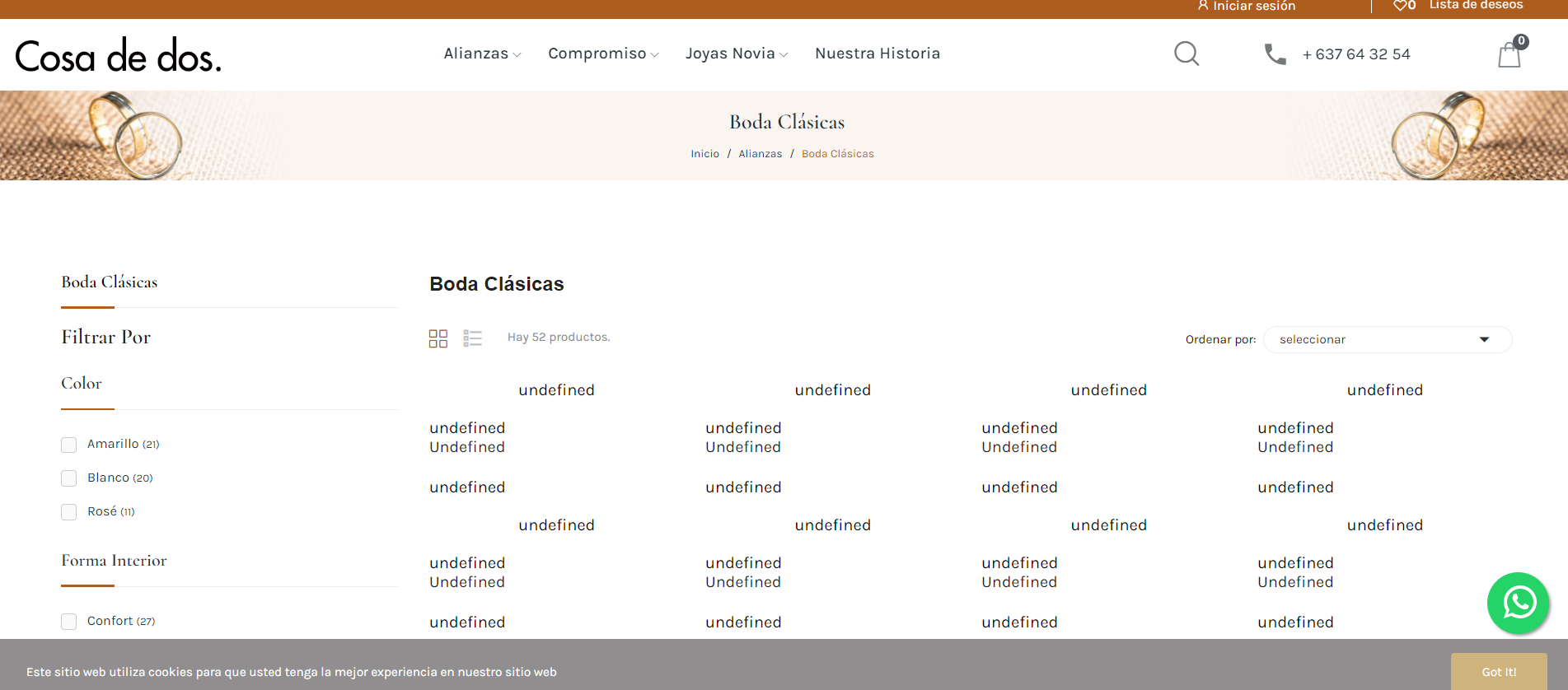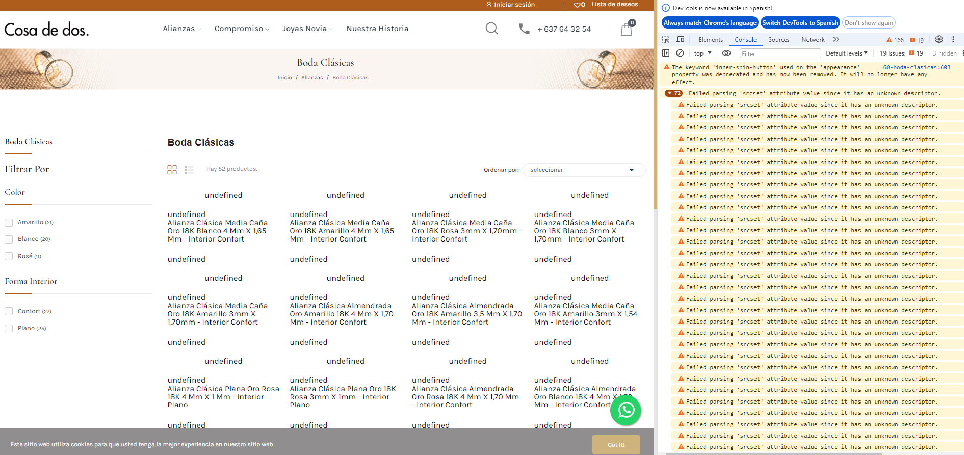 monicaamb Posted April 26, 2024 Share Posted April 26, 2024 ¿Alguien sabe a qué puede deberse este error? Me aparece un undefined en la página de todos los productos. Cuando accedes a la url se cargan pero de repente todo desaparece. Os dejo url: https://test-performanze.bcouple.com/60-boda-clasicas La página de producto sí funciona bien: https://test-performanze.bcouple.com/alianzas-trend/22-5800-alianza-trend-ref60515.html#/154-talla_del_anillo-talla_9 Gracias de antemano!!! Link to comment Share on other sites More sharing options...