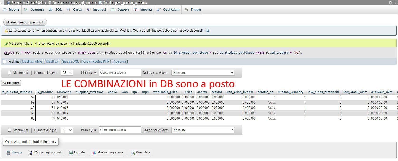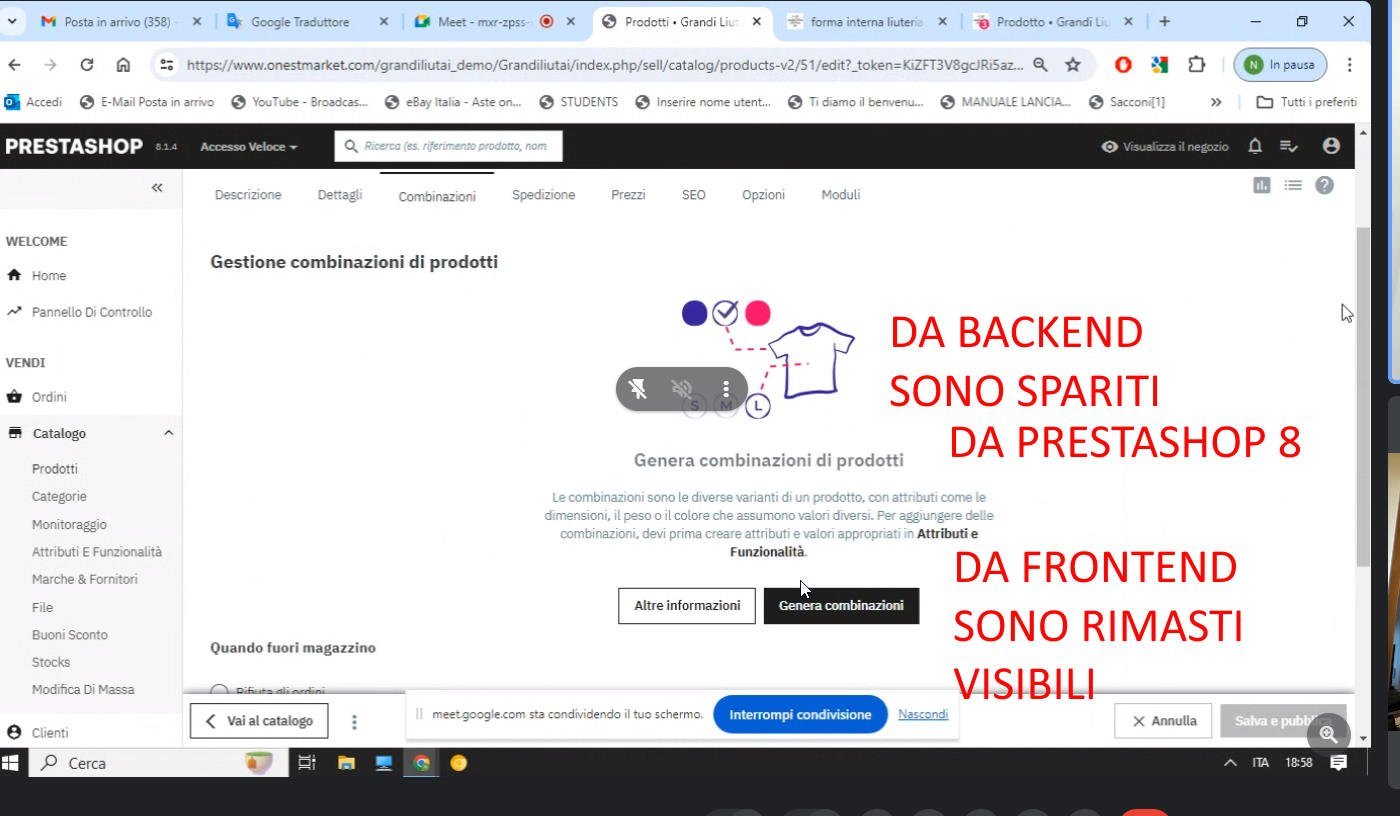 sunwenlong Posted May 3, 2024 Share Posted May 3, 2024 Buongiorno colleghi, ho un problema, eccol la situazione in breve: ho fatto l'aggiornamento in ambiente di TEST da PS 1.7 a 8.1.4 Da Backoffice non riusciamo più a vedere le combinazioni. Mentre dal negozio lato cliente, le combinazioni sono visibili. Le mie domande, banali ma essendo Prestashop 8 freschissimo.... Sapete se c'è qualche fix o bug noto? Sto cercando su Google ma non trovo la mia casistica. Ricordo che sono in TEST, quindi posso rifare la procedura di aggiornamento. Fatemi sapere come potrei sistemare. #prestashop8 #aggiornamento #update #combinazioni #bug Link to comment Share on other sites More sharing options...