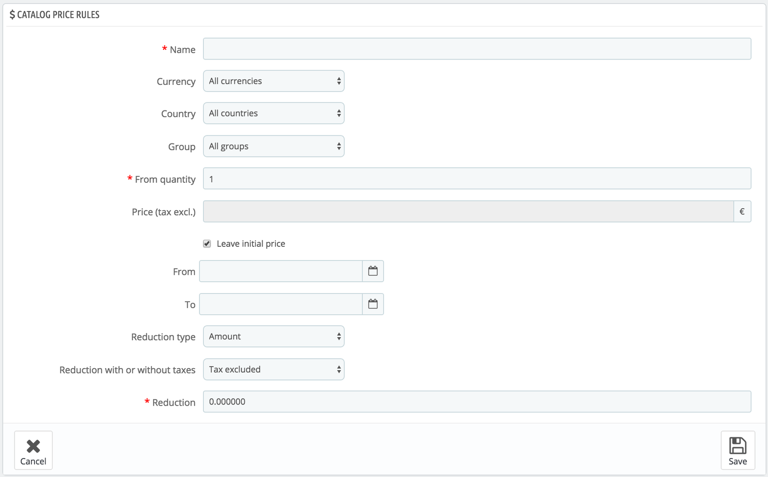 ZHSoft Posted May 10, 2024 Share Posted May 10, 2024 https://docs.prestashop-project.org/v.8-documentation/user-guide/selling/managing-catalog/managing-discounts/catalog-price-rules Catalog Price Rules Catalog price rules enable you to assign price reductions by category, brand, supplier, attribute or feature. As its name implies, this type of rules applies to a range of products; it cannot be used for a single product. If you need a discount applied to a single product, you must create a cart rule instead or create a specific price (in the "Pricing" tab of the product's edition page). For instance, you can set a rule that would say that for Spanish customers belonging to the "Good clients" group would get 10% off on your electronics category and all Sony products for the first week of July. The "Catalog price rules" page lists the currently existing rules, which you can edit or delete by clicking on the action buttons. If you need to disable a rule, simply change its end date to the day before. Creating a new catalog price rule The creation form page has two sections, enabling you to precisely build new rules. Catalog price rules The first form is easy to understand. Link to comment Share on other sites More sharing options...