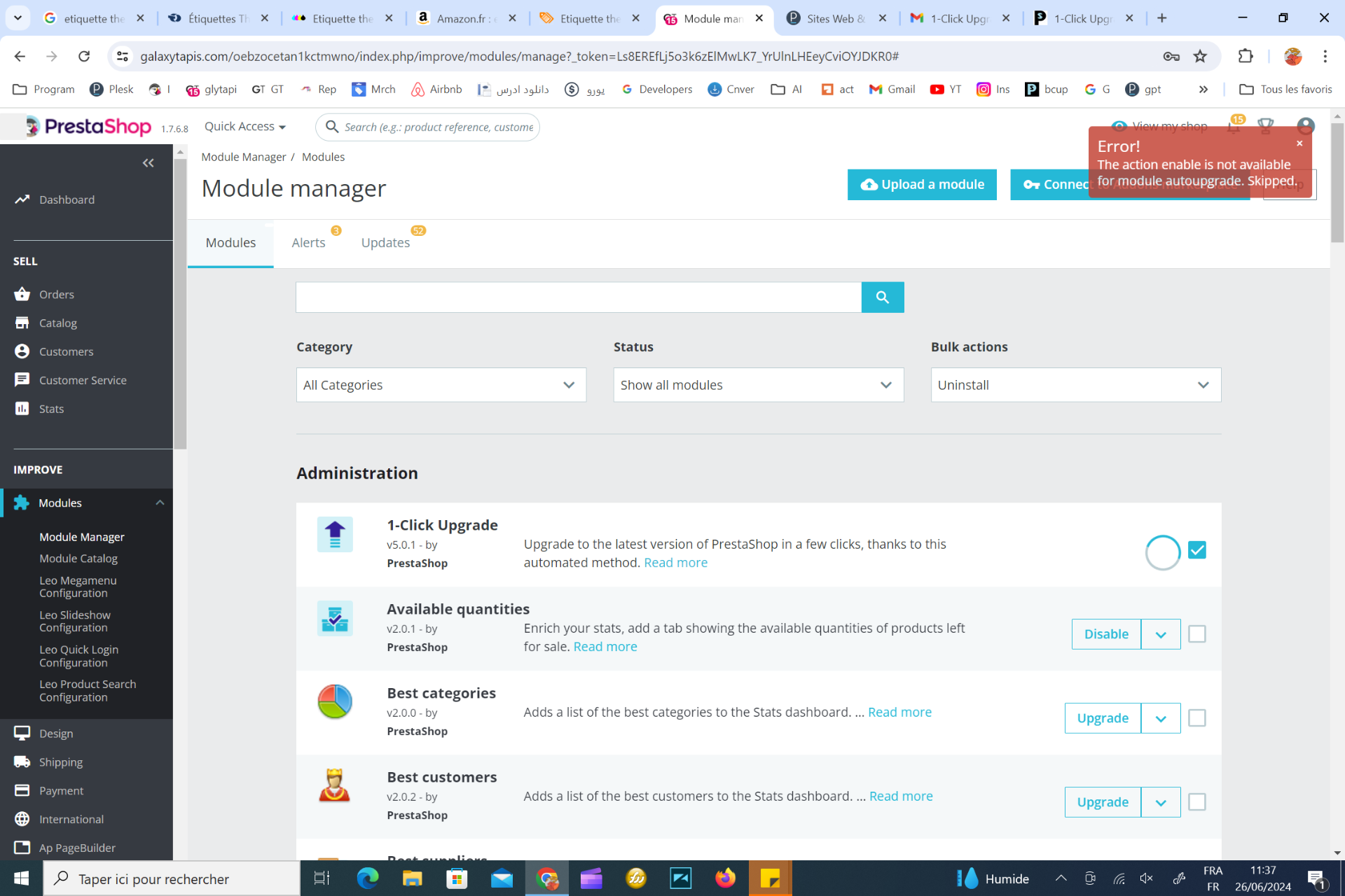 hamid reza Posted June 21, 2024 Author Share Posted June 21, 2024 (edited) 1.7.6.8 to PrestaShop 8.1.6 ??? 1-Click Upgrade v5.0.3 - by Upgrade to the latest version of PrestaShop in a few clicks, thanks to this automated method. do not work in my shop can some one help me. my shop is in french langue. when i click ,it for configure does not work it and after few minute sent me message time out. merci Edited June 21, 2024 by hamid reza (see edit history) Link to comment Share on other sites More sharing options...