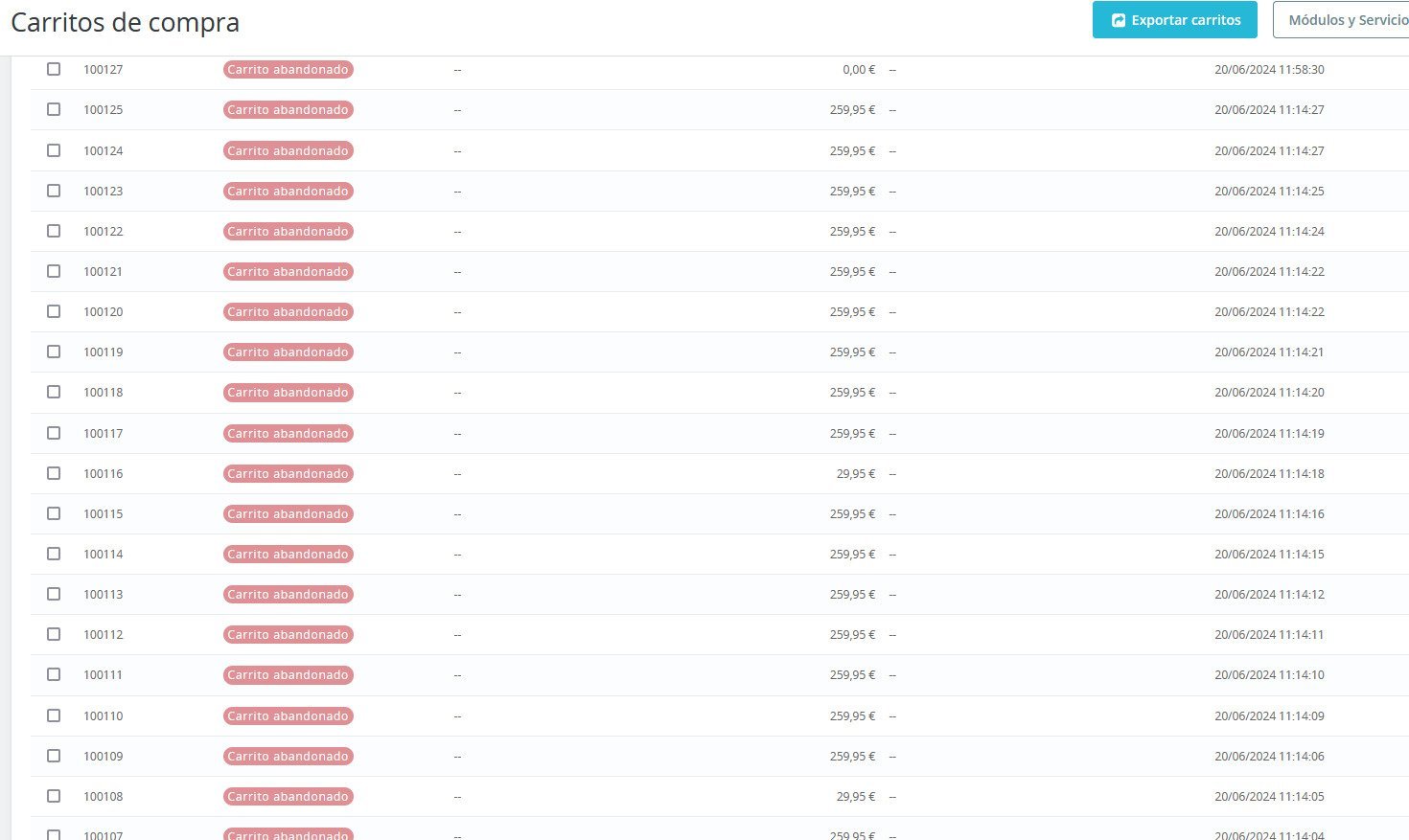 JohnPalomo Posted June 26, 2024 Share Posted June 26, 2024 Hola, Desde hace unos días mi panel de carritos abandonados refleja múltiples carritos del mismo producto con una diferencia de segundos de uno a otro. En el foro de webempresa he leído de otro usuario con el mismo problema pero no se aporta una solución: https://www.webempresa.com/foro/preguntas-sobre-prestashop/un-bot-no-para-de-hacerme-carritos-abandonados-como-lo-bloqueo Os ha pasado? Corro el riesgo de que los recursos de la tienda o servidor generen lentitud de carga u otros problemas a mayores? No sé evaluar la gravedad del tema, no soy desarrollador. Os pego captura donde se puede ver el problema. Con el módulo de superspeed también he podido descargar los csv de conexiones y de carritos abandonados. Aparecen las ip.. Alguna idea de cómo solventarlo? 1 Link to comment Share on other sites More sharing options...