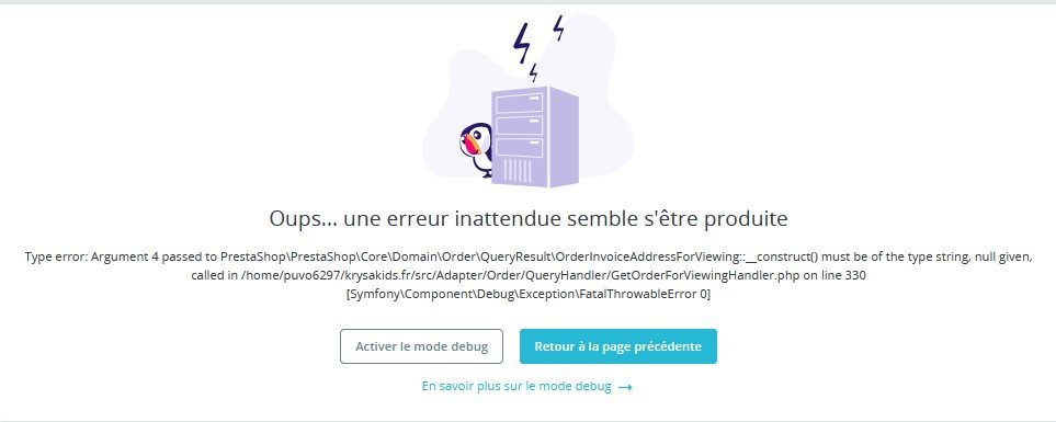 patsav Posted August 9, 2024 Share Posted August 9, 2024 Bonjour, Je tente de migrer mon site d'OVH vers O2Switch. Tout marche à l'exception d'un point essentiel : si je peux voir mes commandes, je ne peux pas acceder au détail : Type error: Argument 4 passed to PrestaShop\PrestaShop\Core\Domain\Order\QueryResult\OrderInvoiceAddressForViewing::__constr uct() must be of the type string, null given, called in /home/puvo6297/krysakids.fr/src/Adapter/Order/ QueryHandler/GetOrderForViewingHandler.php on line 330 Je tourne en rond depuis des jours, un webmaster qui bosse sour WP n'a pas trouvé (mais il ne s'estime pas compétent en prestashop). J'ai tenté toutes les versions php d'OVH (de la 7.2 à 8.XX mais la 7.4 est celle qui marche pour le reste du site (c'est également la version utilisés sour OVH). Quelqu'un aurait une idée des réglages que j'aurais pu rater pour correiger ce seul et unique point qui bloque ? Erreurs_acces_details_cde_debug.pdf Link to comment Share on other sites More sharing options...