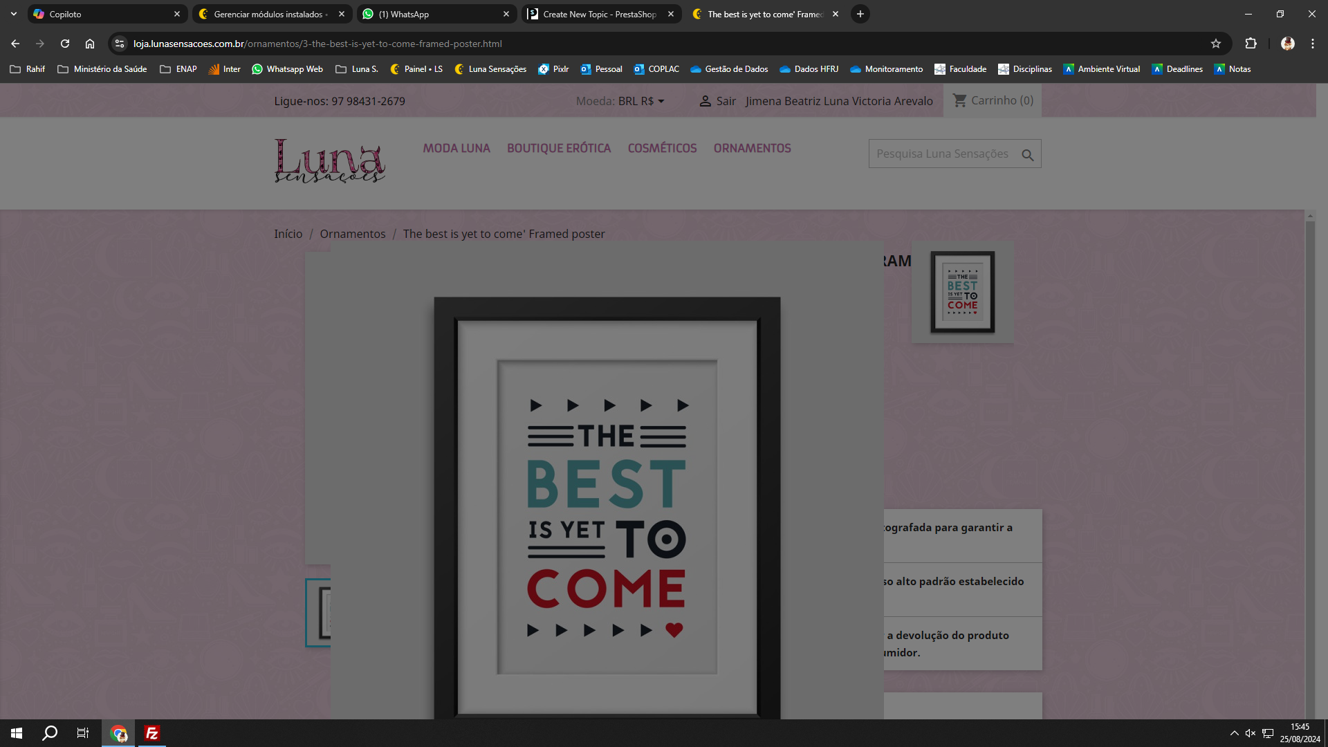 Rahkun Posted August 25, 2024 Share Posted August 25, 2024 Gentlemen, good afternoon. Would someone help me finding the problem that, unfortunately, disables my zoom function on my page? Already tried another zoom module, caused other conflict. Chrome Console only accuses 3 errors that seems not to be connected with my problem, i guess. My page url: https://loja.lunasensacoes.com.br/ As the title says, it's a Prestashop 1.7.3.3 store, and the product zoom isn't working properly (darken screen, can't (x) close or ESC exit). Looked all around, tried Copilot and ChatGPT, forums and many options, no success. Could someone help me? Please. Thanks in advance. Regards. Link to comment Share on other sites More sharing options...