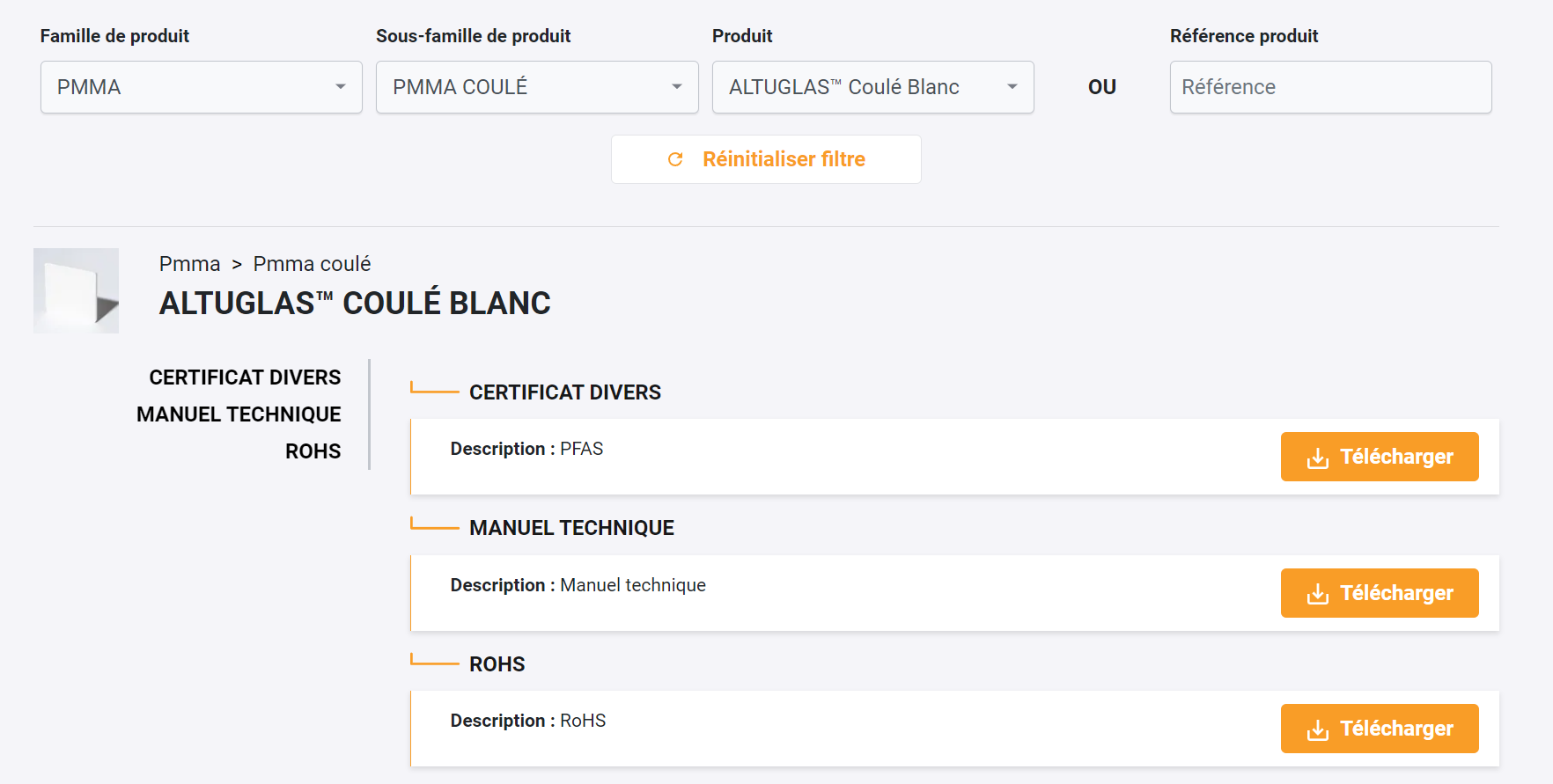 EmPSM Posted October 1, 2024 Share Posted October 1, 2024 Bonjour, Je fais appel à vos connaissances, peut-être que vous pouvez m'apporter une solution ou une piste. Je souhaite mettre à dispo des visiteurs une bibliothèque de documents à partir d'un formulaire avec par exemple 3 champs (famille de produits / sous famille et produit), pour ensuite avoir à dispo en téléchargement tout les docs qui correspondent à ce produit. Exemple : dans l'idée ; le champs "famille de produit" est une catégorie (PMMA), le second champ "Sous famille" serait les sous catégories (PMMA coulé / PMMA XT) et le champ "produit" serais la liste des produits correspondant, et lorsque je choisi le produit, touts les docs de ce produit seraient proposés au téléchargement. Alors je cherche un module qui permet de faire cela basé sur l'arborescence des catégorie de ma boutique et qui propose les docs que j'ai sélectionnées dans BO de chaque fiche produit ou alors le module en BO me propose d'indiquer quels docs mettre à dispo selon le scenario de filtre. J'ai tenté de créer un code html et javascript, mais c'est long à faire et il faut intégrer tous les liens manuellement et lors d'ajout de nouvelles documentations, il faut mettre à jour le code, ce qui impose que je sois le seul à traiter l'intégration de docs. ca Je cherche une solution pratique. un screen pour montrer ce que j'ai vue sur un site qui est réalisé avec prestashop. en regardant le code je pense que ce module à été dev juste pour cette boutique. Merci d'avance Link to comment Share on other sites More sharing options...