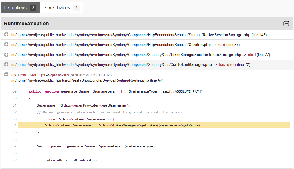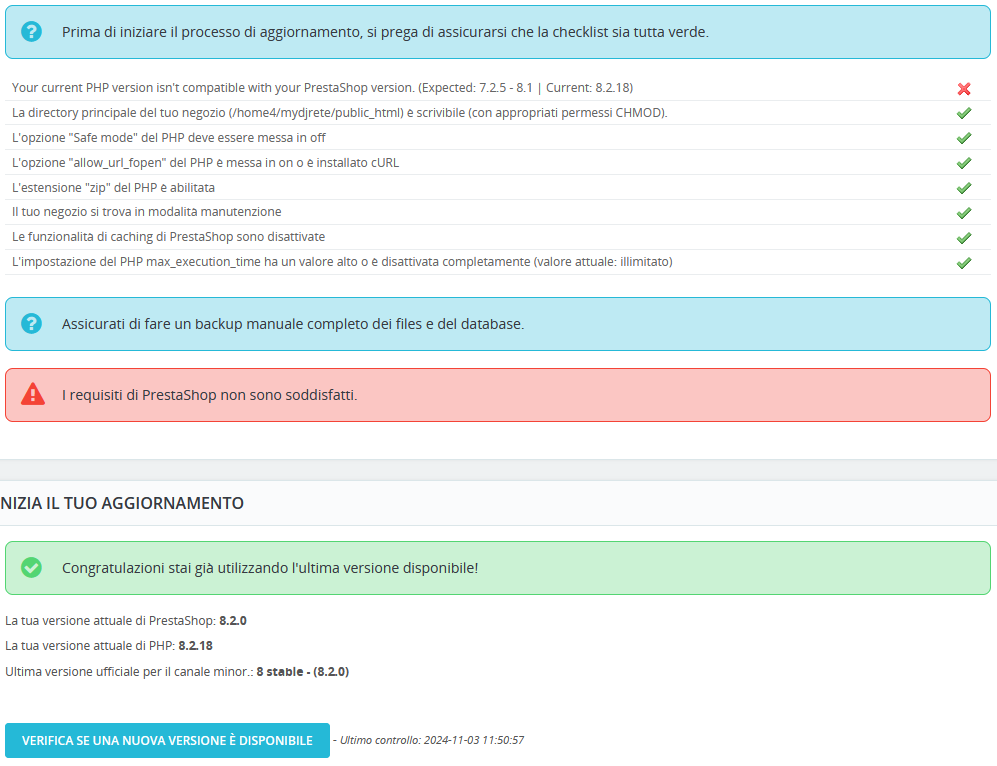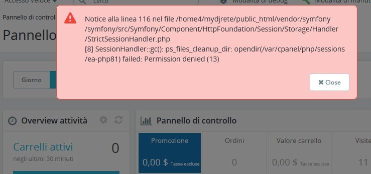Desir Corredi Store Posted November 3, 2024 Share Posted November 3, 2024 I have a problem with Prestashop 8.2.0 because the compatibility error message appears for the PHP version which instead turns out to be 8.1... after debugging, 2 error messages come out. ErrorException Notice N.1: CsrfTokenManager->getToken('ANONYMOUS_USER') in /home4/mydjrete/public_html/src/PrestaShopBundle/Service/Routing/Router.php (line 64) Notice N.2: SessionHandler::gc():ps_files_cleanup_dir: opendir(/var/cpanel/php/sessions/ea-php82) failed: Permission denied (13) ... could anyone help me resolve this. Thank you. Link to comment Share on other sites More sharing options...