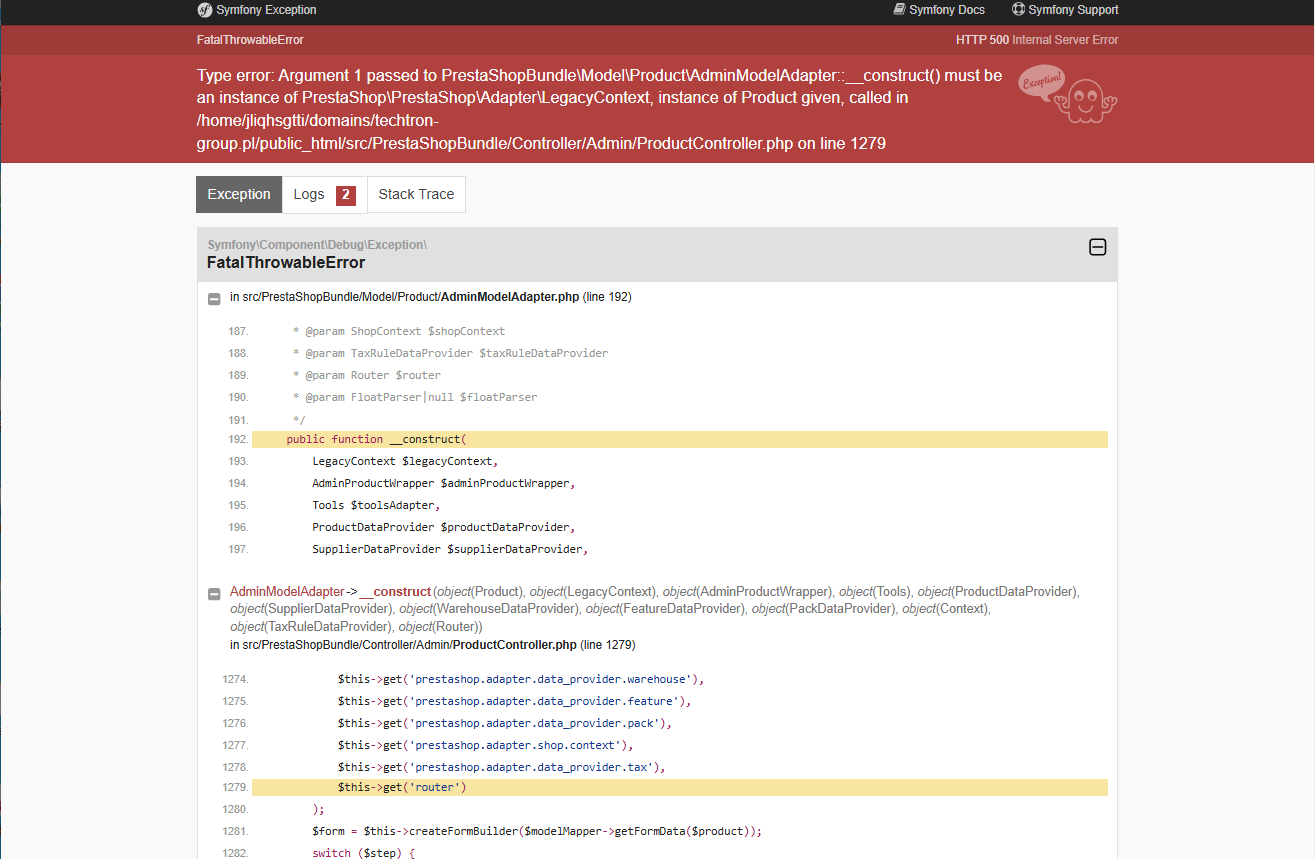 Argument 1 passed to PrestaShopBundle\Model\Product\AdminModelAdapter::__construct() must be an instance of PrestaShop\PrestaShop\Adapter\LegacyContext, instance of Product given, called in /home/admin/domains/techtron-group.pl/public_html/src/PrestaShopBundle/Controller/Admin/ProductController.php on line 1279