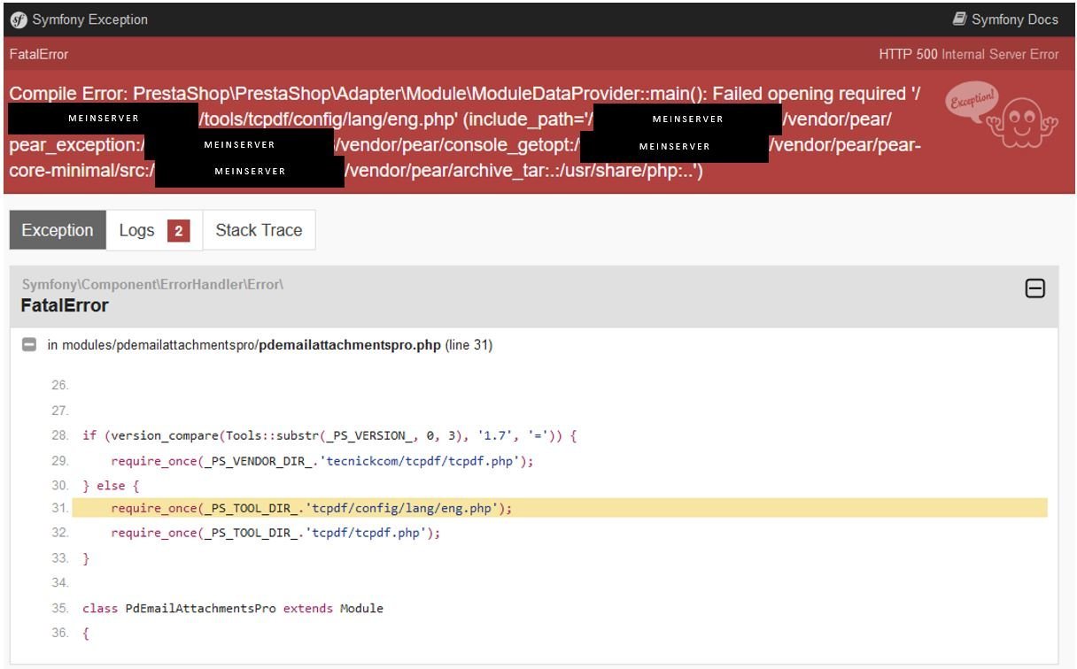 Marc44 Posted November 17, 2024 Author Share Posted November 17, 2024 @ JBW da hast vollkommen Recht. Das war der Fehler. Es handelt sich dabei um das Modul „Email Templates Manager“. Das Modul wird nur bis zur PrestaShop Version 1.7.8 unterstützt. Nach dem Update auf PrestaShop 8.2.0 hat das Modul den o.g. Fehler verursacht. Nach dem Umbenennen des Ordners „pdemailattachementpro“ funktionier der Modulmanager wieder. Vielen Dank an JBW und der ganzen Community für die Hilfe und beste Grüße. Link to comment Share on other sites More sharing options...