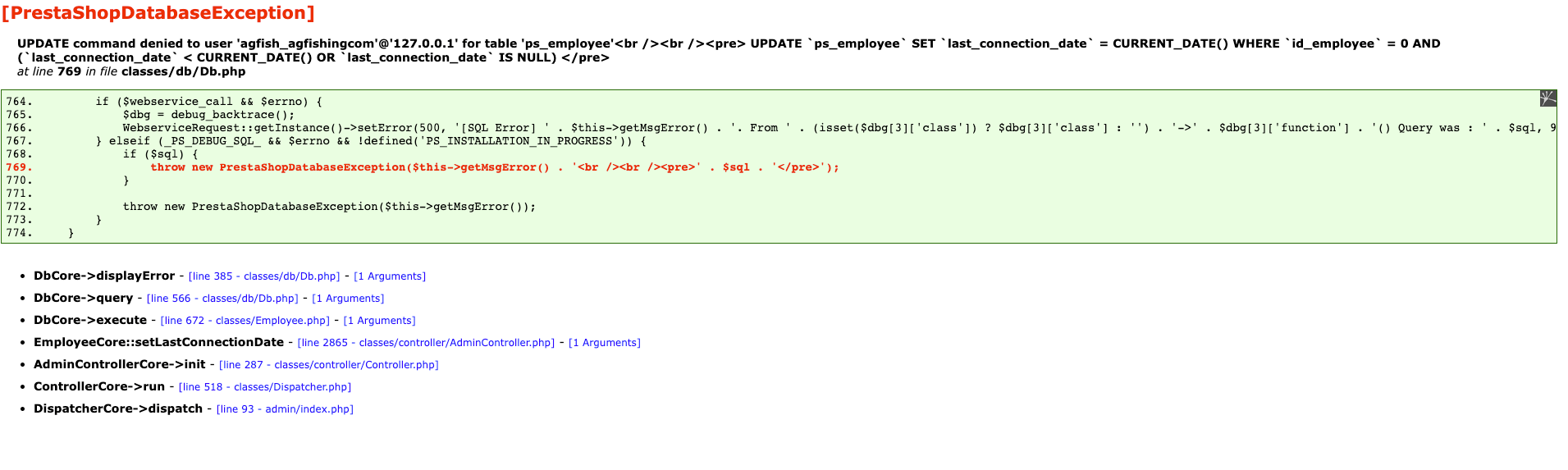 Ciao, quell'errore è perchè hai il permesso di accedere al DB in lettura,, ma non di effettuare operazioni su di esso, o almeno su alcune tabelle tra cui ps_employee.