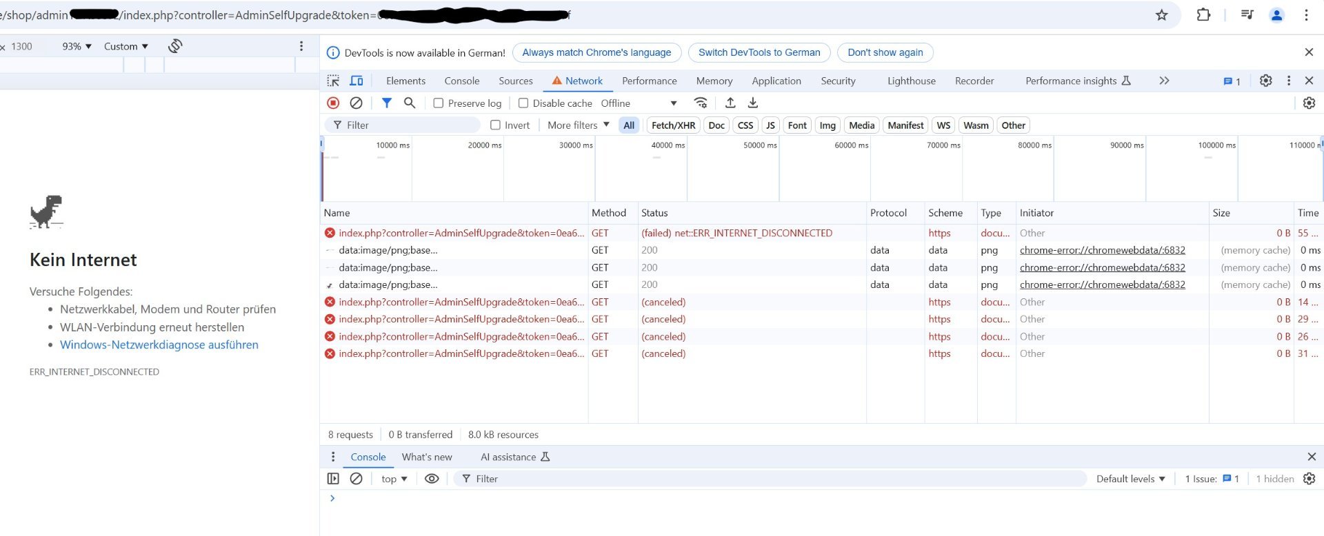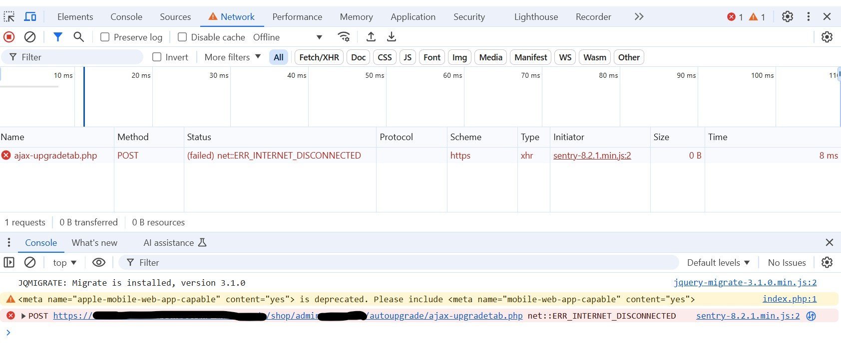 Abdurahman-Amat Posted November 27, 2024 Author Share Posted November 27, 2024 19 hours ago, Prestashop Addict said: Please look at network tab and response tab Hi, here are some error infors from the Network tab of the "Developer Tools" window of Chrome This error is occured when I press the "Upgrade" button. And I tried to refresh the page with "Refresh" symbol, then this happned. The page was not reachable, due to some internet network problem. The refresh works when I close the "Developer Tools" window of the Chrome browser. My desktop PC is connected to the internet via a proxy server. Does this reaching internet via Proxy server have anything to do with this problem? Link to comment Share on other sites More sharing options...