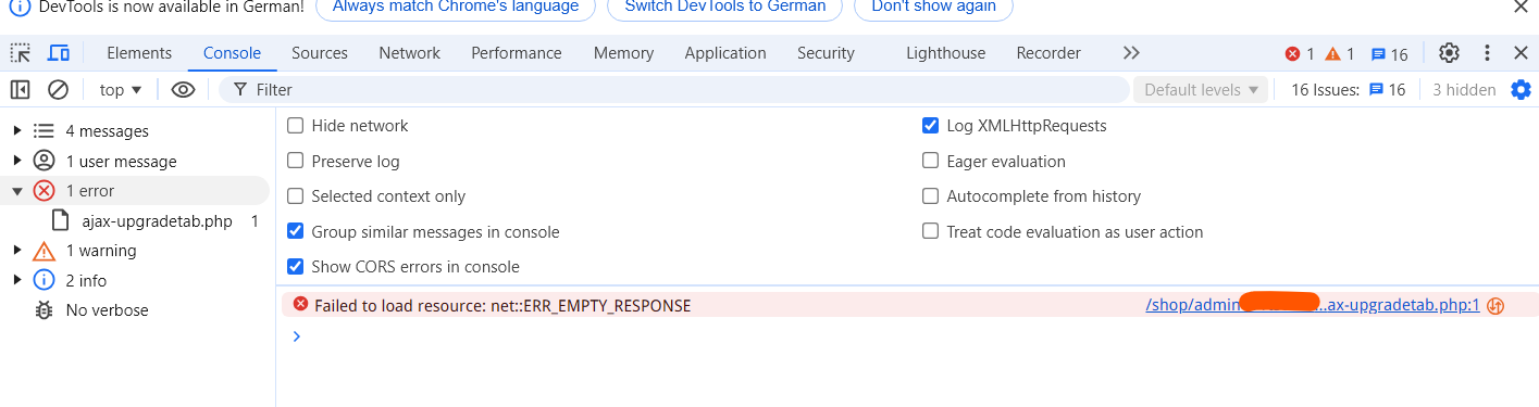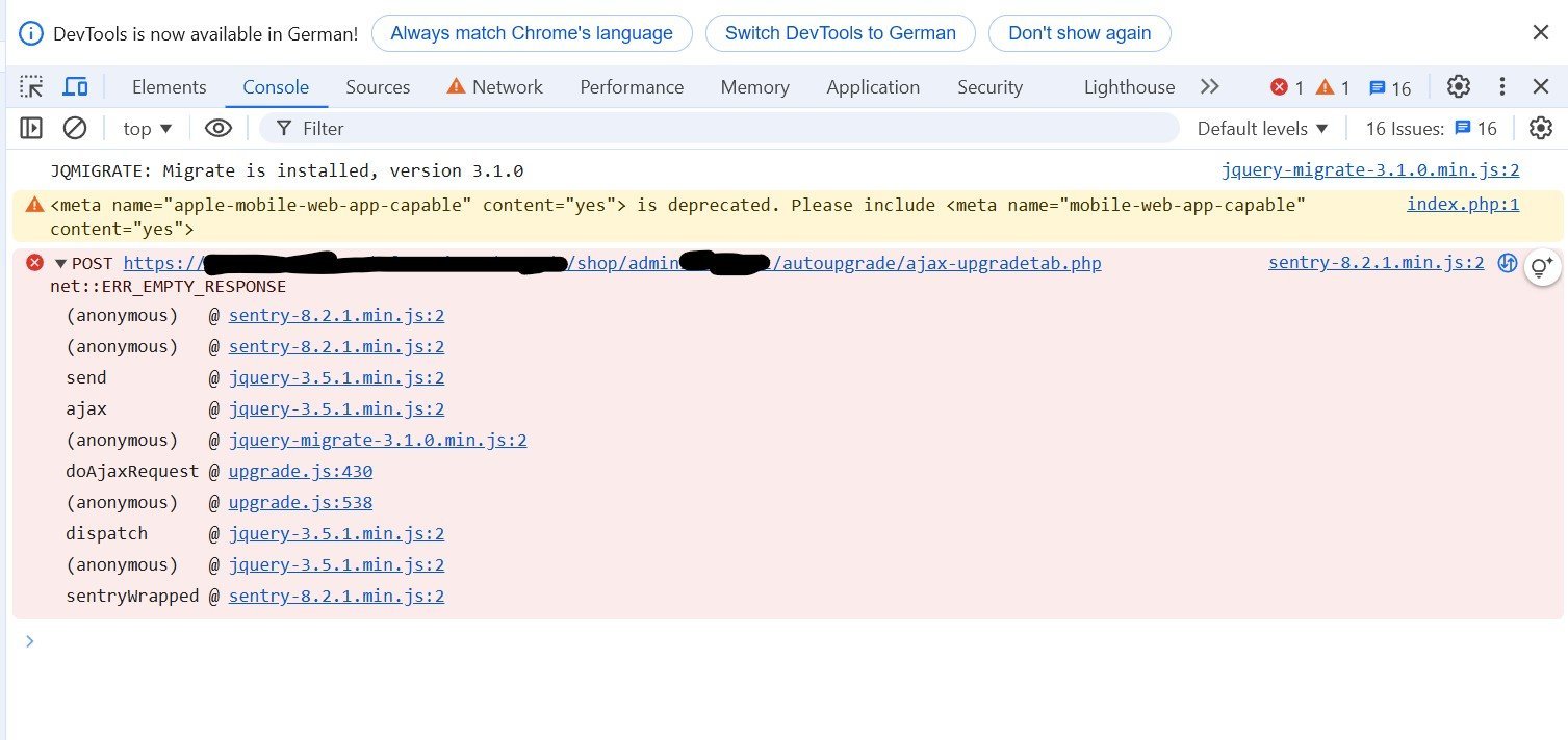 Abdurahman-Amat Posted November 26, 2024 Author Share Posted November 26, 2024 (edited) 3 hours ago, Prestashop Addict said: Try to set PS debug mode before runnning upgrade and look at xhr response en browser console to see the error detail Hi, thanks for your tip! I enabled the Debug Mode and opened the Developer Tools window of Chrome Browser . When I click the Upgrade button, the following error is occured. I thought the POST method to send a "ajax-upgradetab.php" file to .../admin***/autoupgrade/ forlder, when the Upgrade option of the 1-Click-Upgrade is clicked. This sending was failed and the handshaking ckeck is showing that "net::ERR_EMPTY_RESPONSE" error. Am i at least partially right? 1. Meanwhile I change edited the php.ini file and changed "UPLOAD_MAX_FILESIZE" to 200M (it was 10M) and "max_file_uploads" to 200 , "Max_execution_time" to 3000 . 2. I checked the permission of the .../autoupgrade/ directory and gave 777 , with "chmod -R 777 <that directory>" permission that it is definitely writable. Unfortunately, the upgrade was not successful and still showing the same error on the Browser Console. Any hint would be highly appreciated! Edited November 26, 2024 by Abdurahman-Amat (see edit history) Link to comment Share on other sites More sharing options...