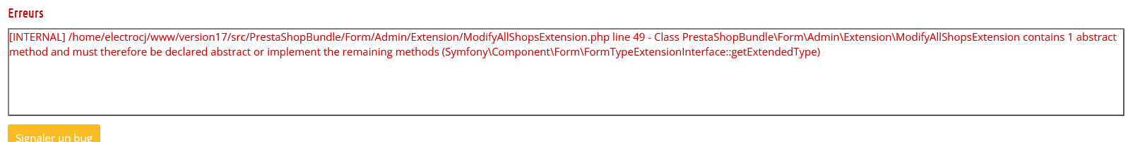djo1919 Posted December 10, 2024 Author Share Posted December 10, 2024 (edited) THank you for your reply. I restored it. Now I decided to disable the template and replace it with the default theme before upgrading to 1.7.8 instead during the upgrade I've got this error (1-Click update module).Now I've got this problem: [INTERNAL] /home/www/src/PrestaShopBundle/Form/Admin/Extension/ModifyAllShopsExtension.php line 49 - Class PrestaShopBundle\Form\Admin\Extension\ModifyAllShopsExtension contains 1 abstract method and must therefore be declared abstract or implement the remaining methods (Symfony\Component\Form\FormTypeExtensionInterface::getExtendedType) Edited December 10, 2024 by djo1919 (see edit history) Link to comment Share on other sites More sharing options...