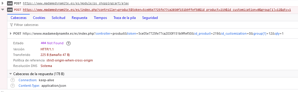 y cuando pulso en las distintas tallas, lo que veo es que la tienda hace peticiones ajax pero la respuesta es 404.
