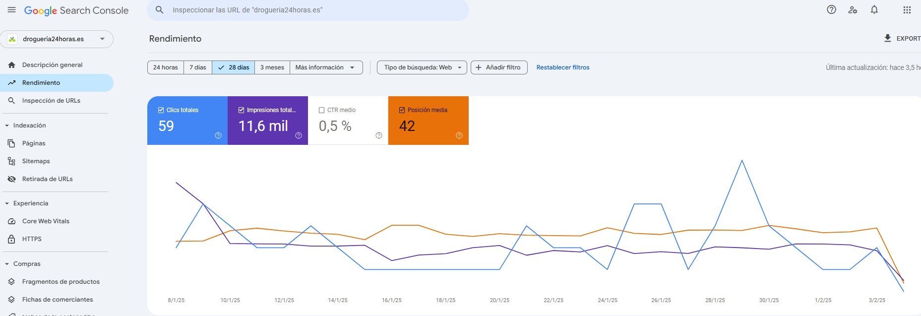 elbujias_ Posted February 6, 2025 Share Posted February 6, 2025 (edited) Buenos días, Estoy creando una tienda online y sin realizar ninguna modificación desde hace al menos 20 días, he sufrido una caída pronunciada en posicionamiento el día 4/02. No sé si hay algo que estoy haciendo mal...pero venía manteniendo una posición regular y se ha desplomado de repente. No sé que ha podido perjudicar para esta caída. ¿podéis ayudarme a entender lo sucedido? Me gustaría conocerlo para mejorar y poder subir. Saludos, Edited February 6, 2025 by elbujias_ (see edit history) Link to comment Share on other sites More sharing options...